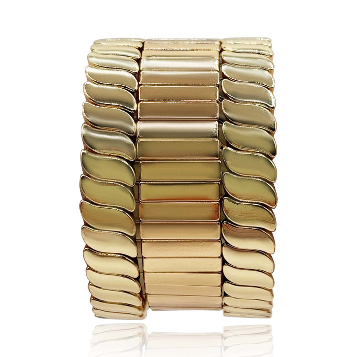 This is a three-piece elasticized bracelet set crafted from gold plating with a swirl design.