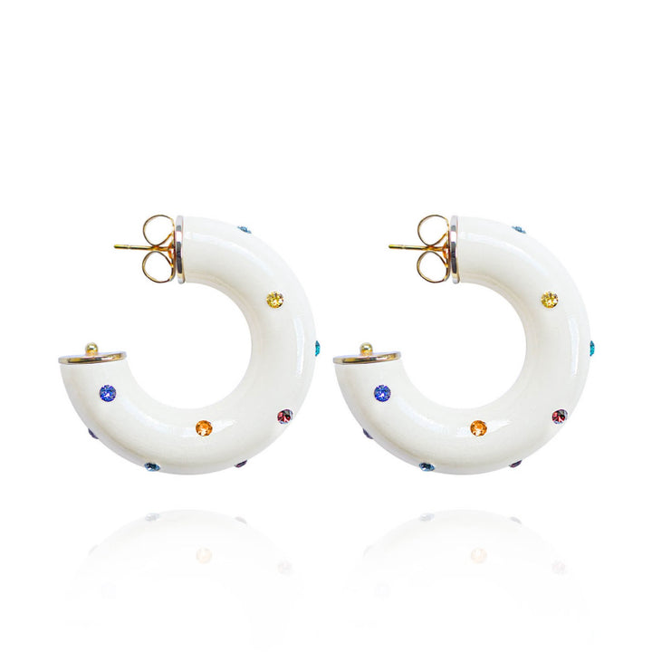 These hoops are handmade with non-toxic paints on a wood base and top, with Austrian crystals, 18K gold-plated hardware, and a stainless steel post.