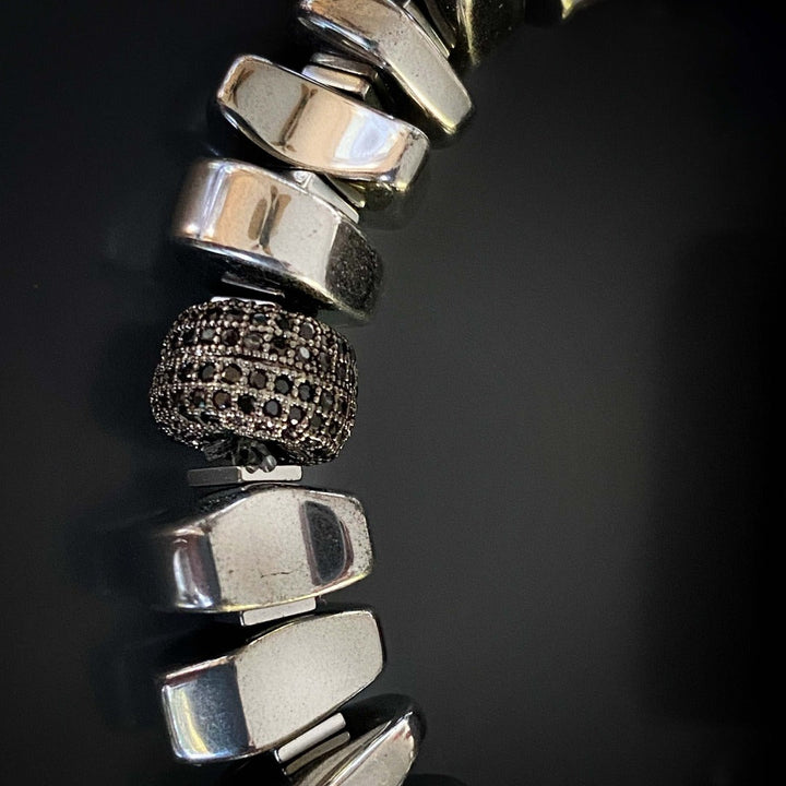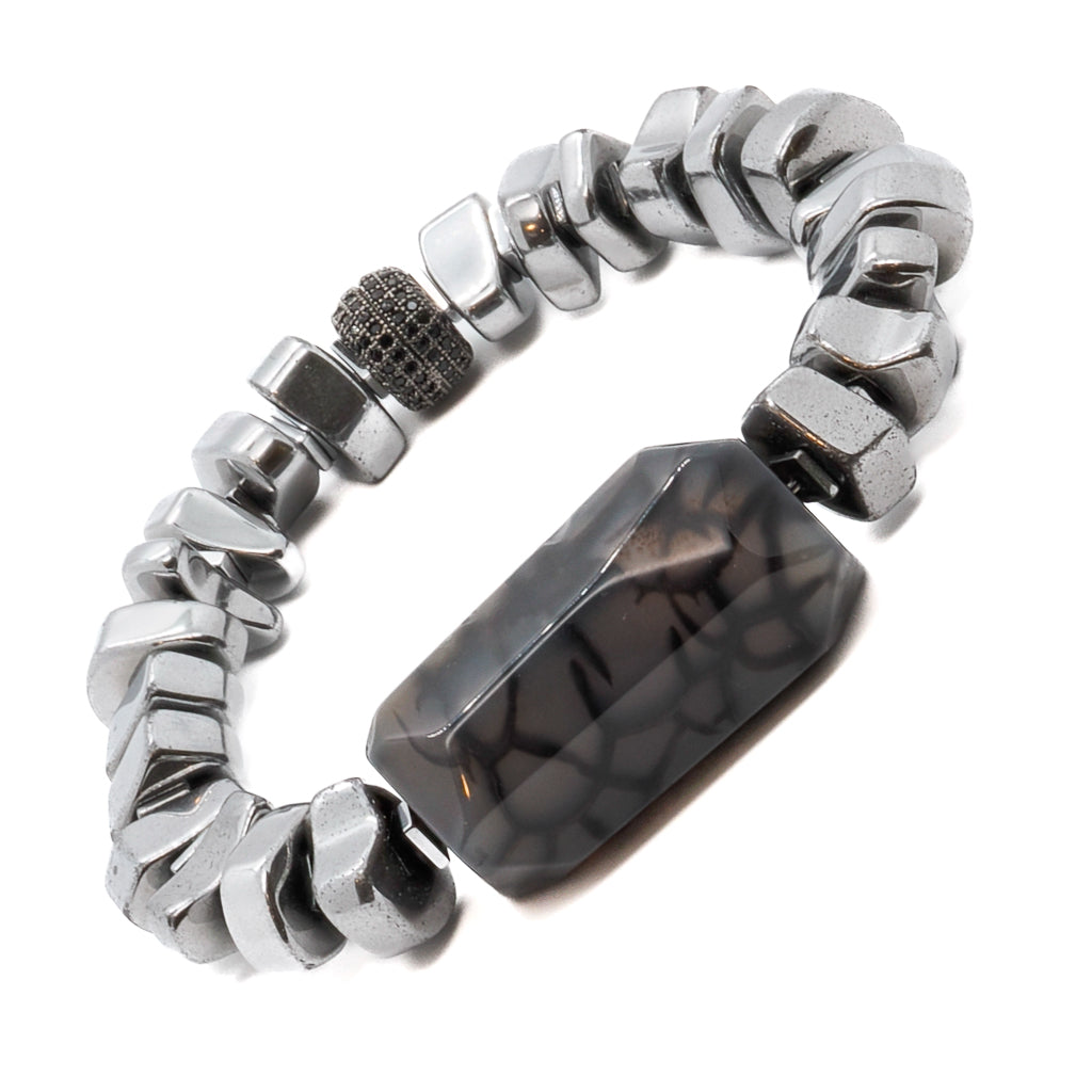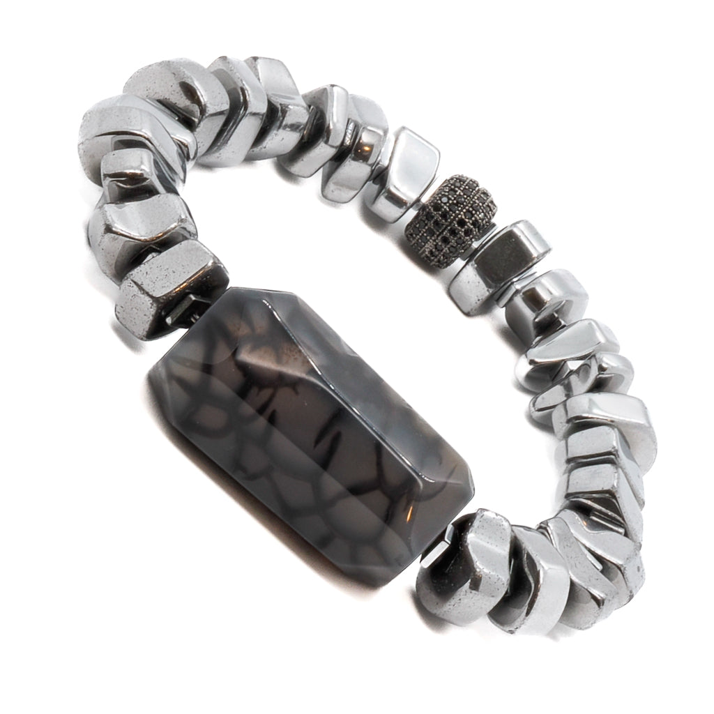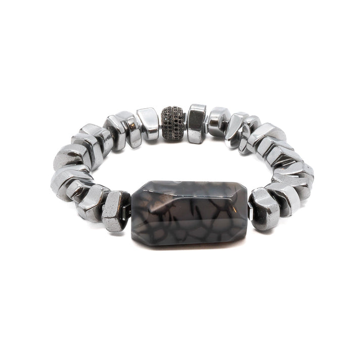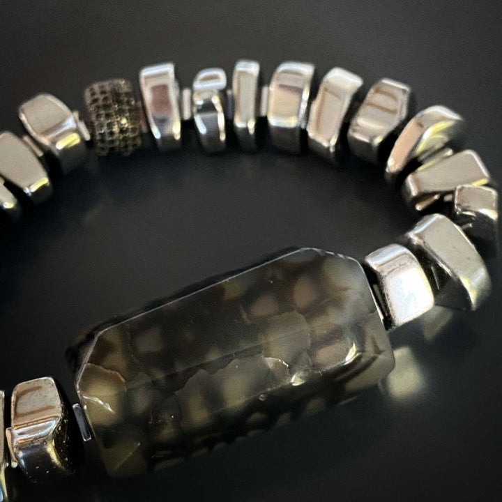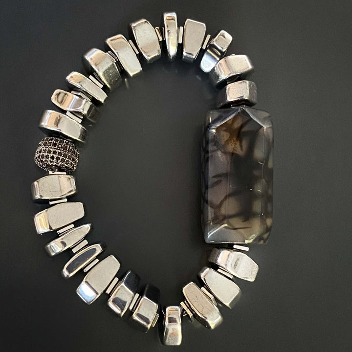 This Stylish Mila Bracelet by Ebru Jewelry is a chic and fashionable piece that combines sophistication and boldness. The nugget silver colored hematite beads add a touch of luxury, while the large jasper stone bead is the centerpiece, exuding a bold and striking appeal. A black Swarovski crystal bead provides a subtle yet stunning contrast, making this a truly unique accessory.
