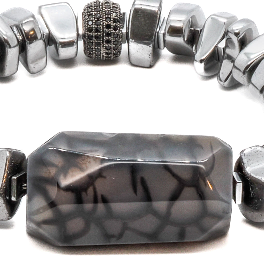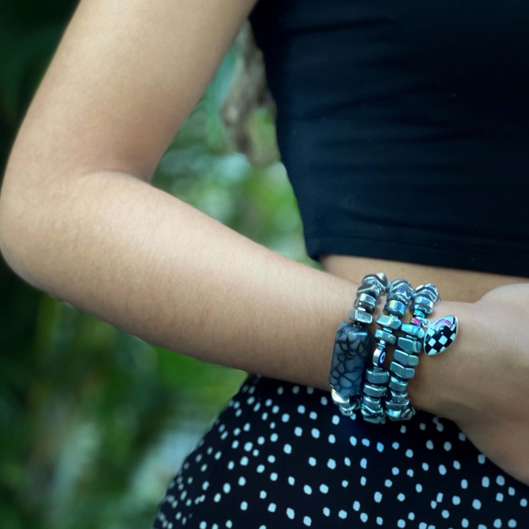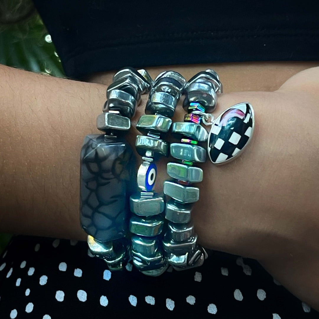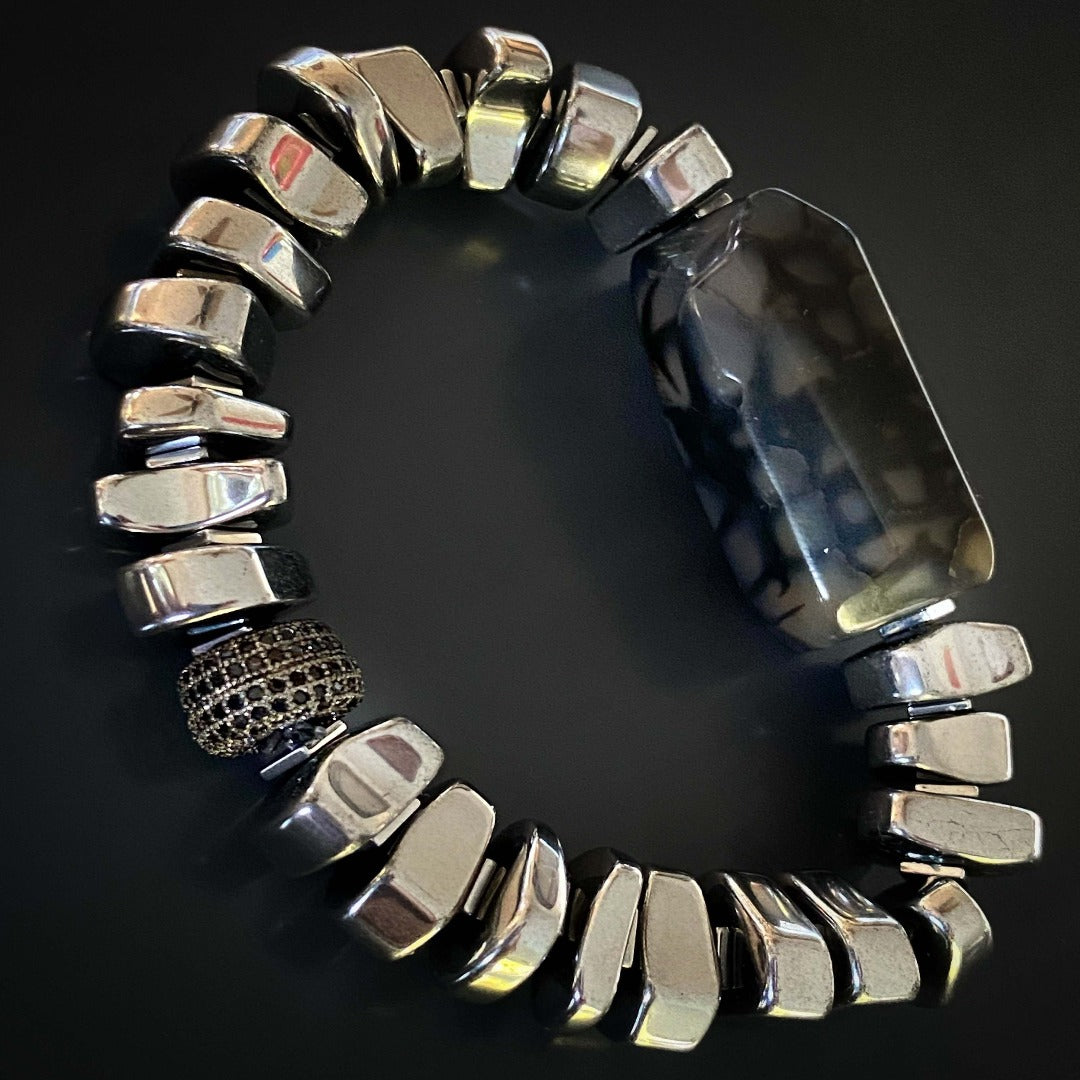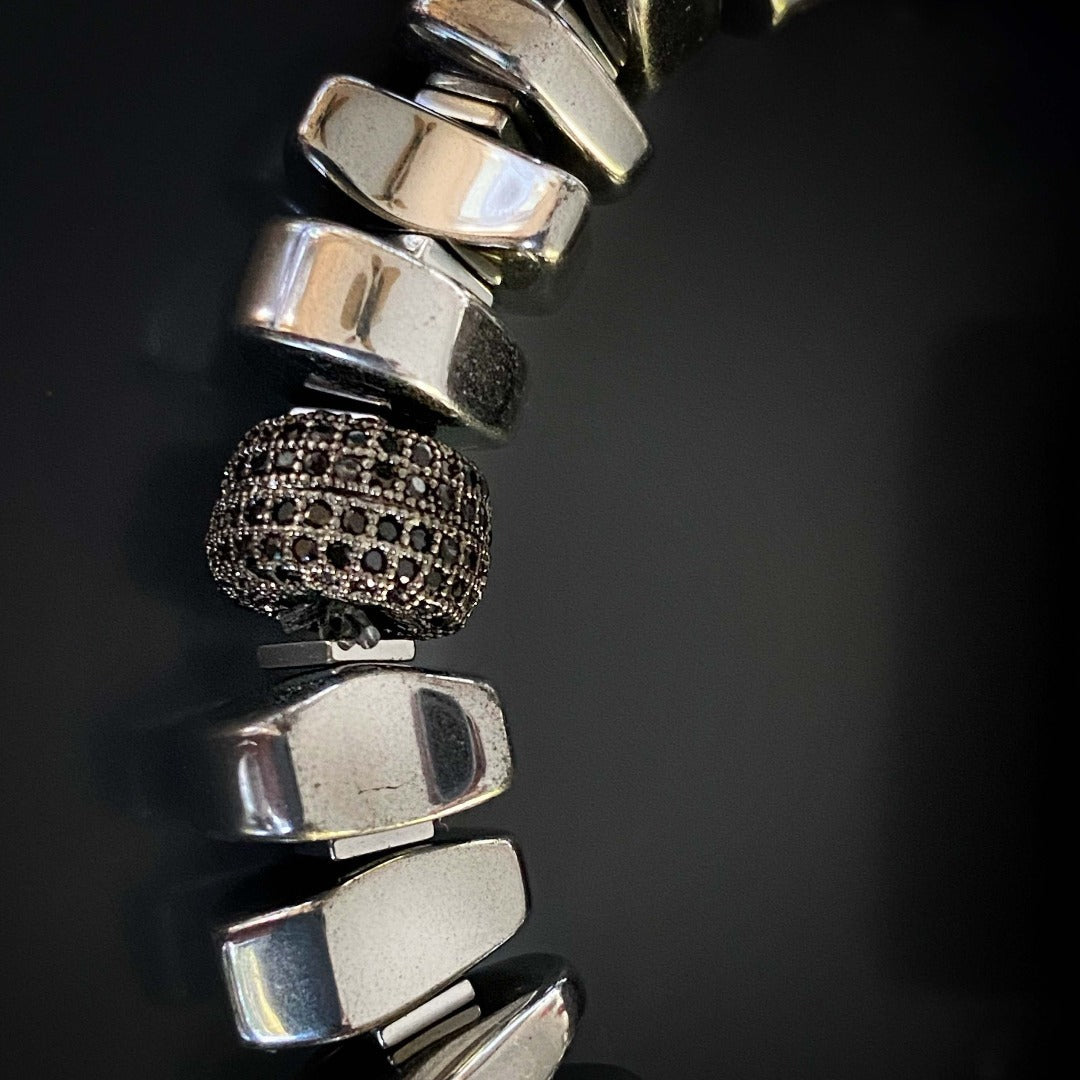 This bracelet is made of nugget silver color hematite beads, hematite spacers, a large jasper stone bead, and a black Swarovski crystal bead. It is 6.5 inches in size and is made on a high-quality stretchy jewelry cord.