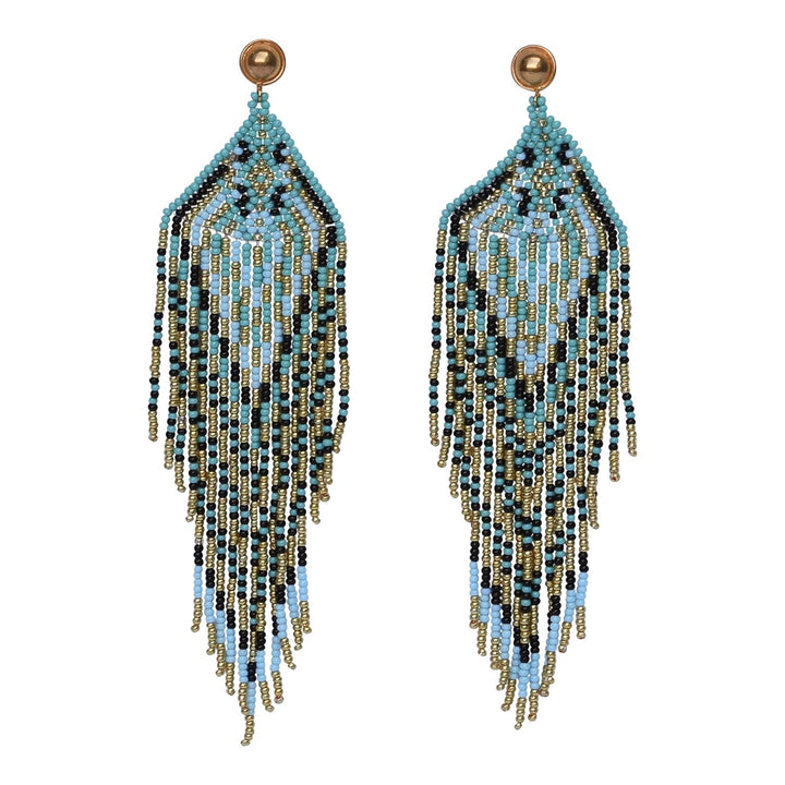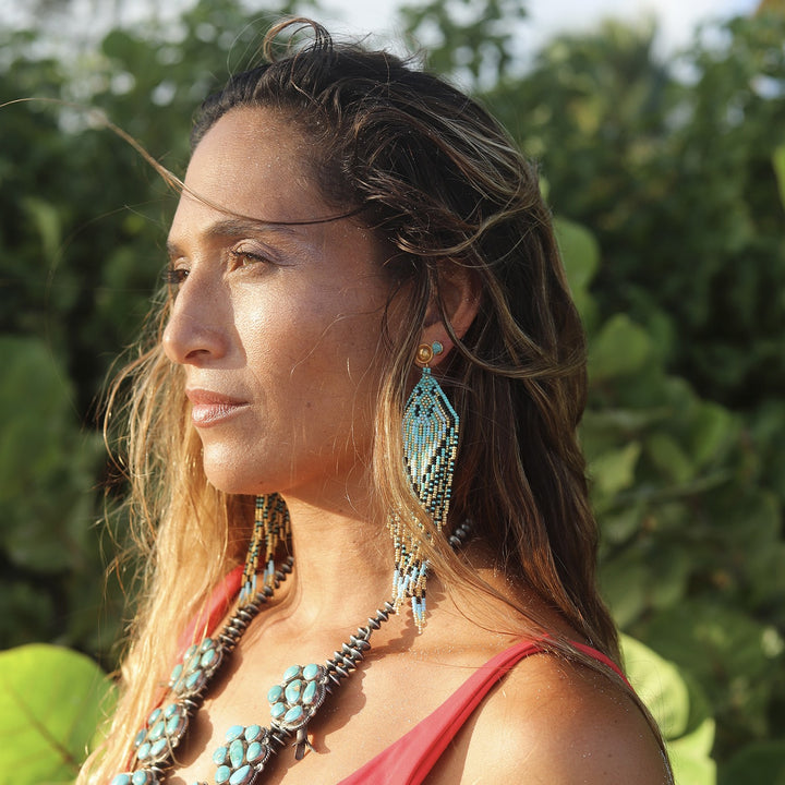 These Divine Turquoise Earrings by Good Tidings Style are a magnificent and empowering statement piece. The hand-beaded design, composed of an assembly of colored beads, creates a beautiful and intricate pattern. Handmade by a women's collective, these earrings are a work of art, perfect for those who appreciate craftsmanship and meaning.
