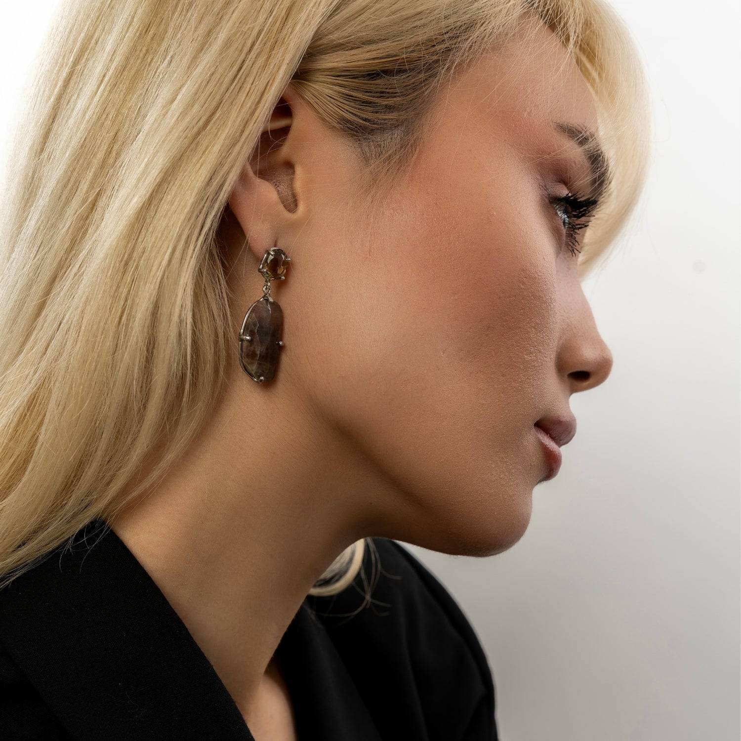 These earrings are crafted from silver with natural irregular purple gemstones. The small gemstone is 10mm, and the large gemstone ranges from 15-25mm. Total earring length is 35-45mm. Store in a dry, cool place.