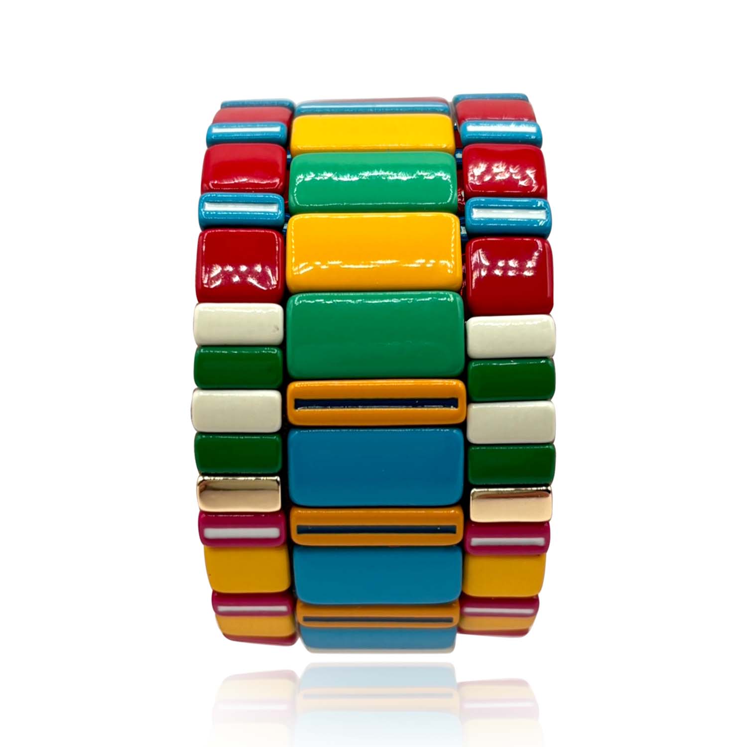 This set of Three Enamel Multi-Color Elasticized Bracelets by Michael Nash Jewelry is a versatile accessory designed to offer flexibility and style. Whether worn together as a stacked set or separately, they are a delightful combination of neutrals and primary colors that pair seamlessly with a wide range of outfits. The elasticized design ensures a comfortable fit, making them an effortless way to add a pop of color to your wardrobe.