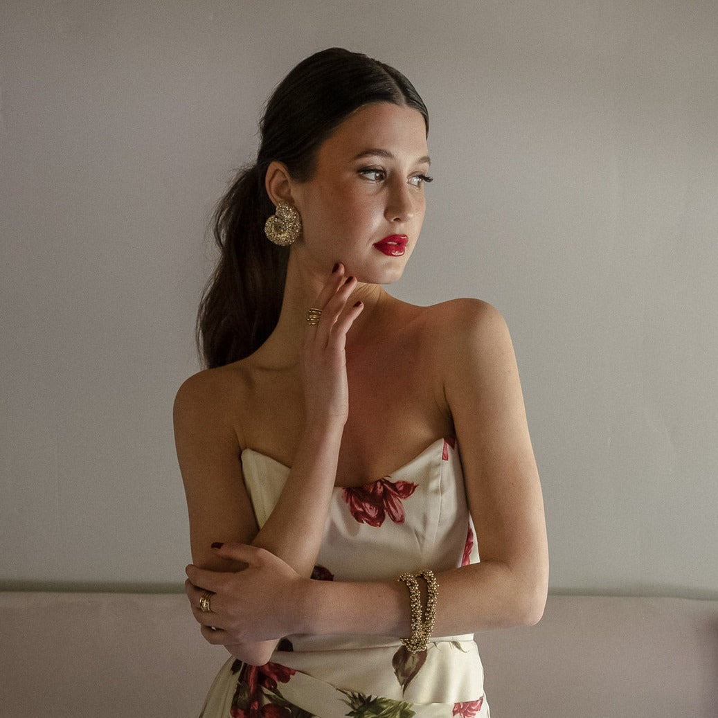 These Nautilus Earrings by Zepplin the Label are a stunning statement piece. Inspired by the nautilus fossil, they are handmade from gold-plated brass and cubic zirconia, creating a luxurious and sculptural look. These bold, large-shell earrings are perfect for adding a touch of golden glamour to your spring and summer rotation.