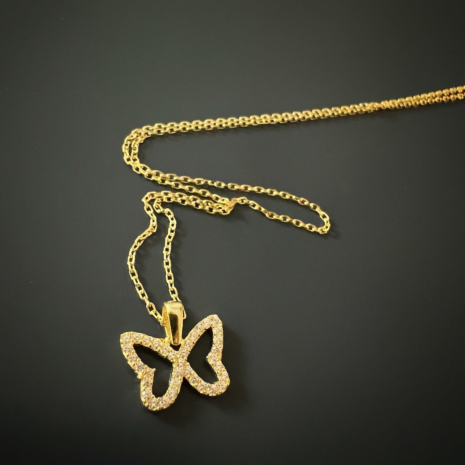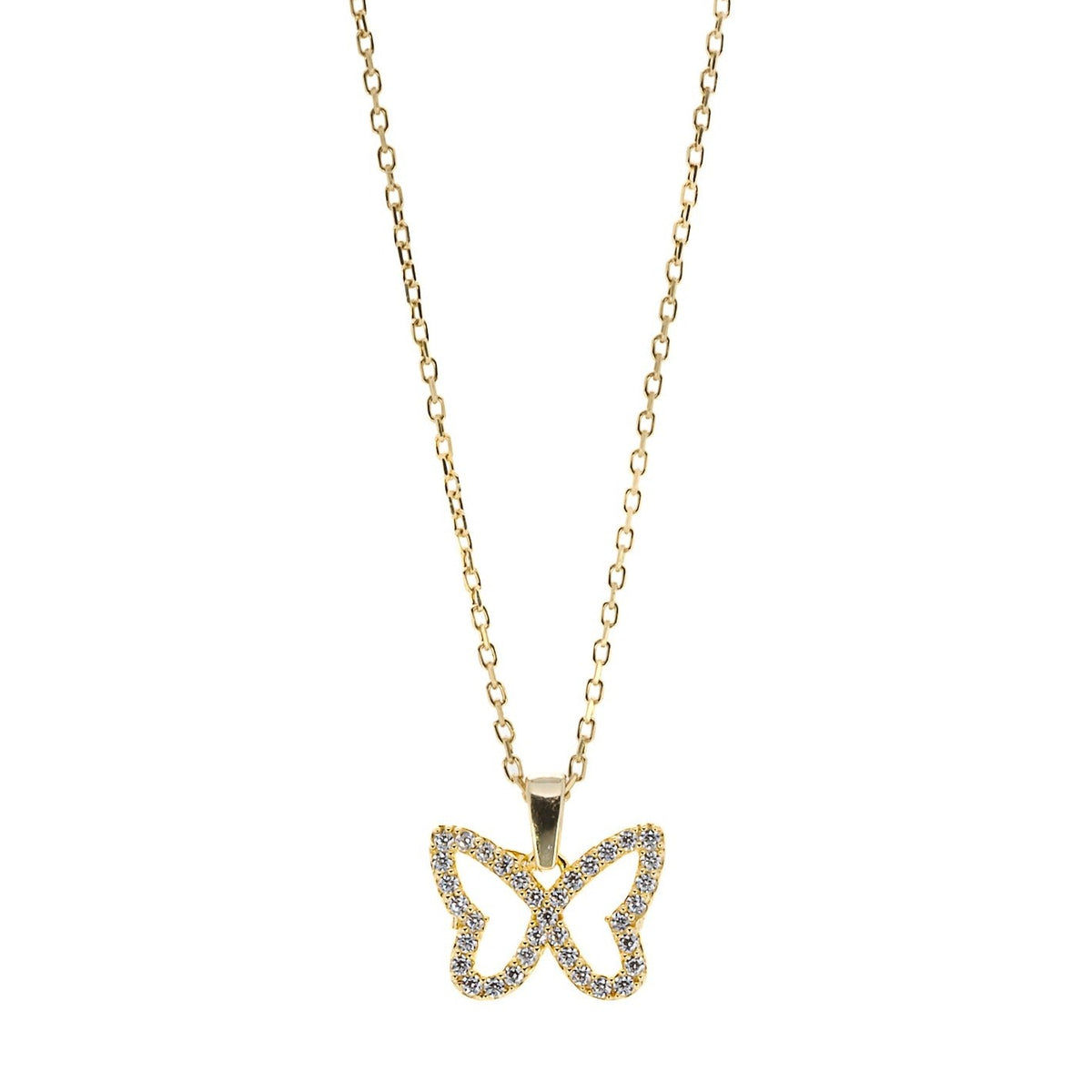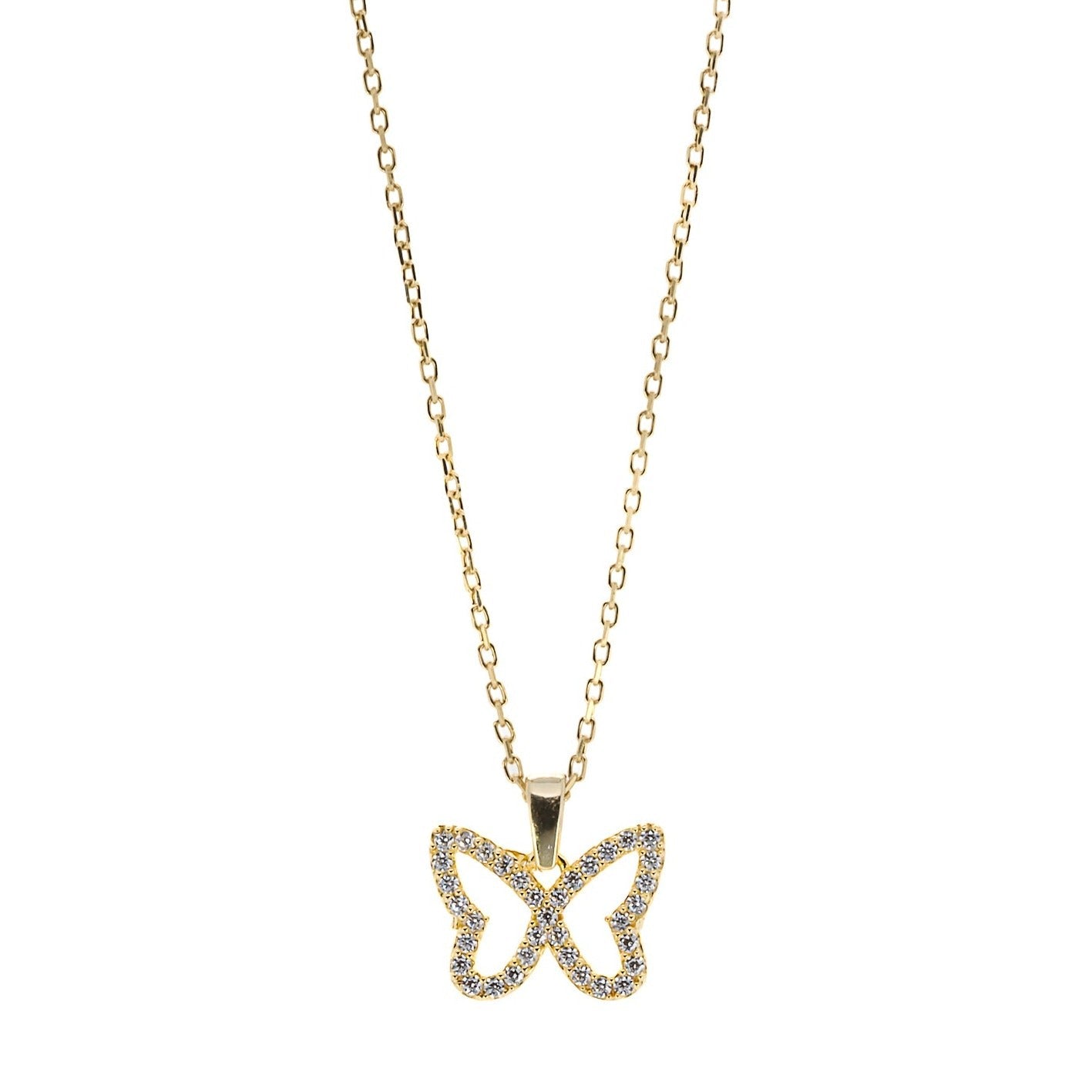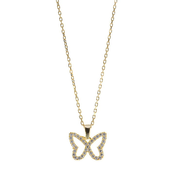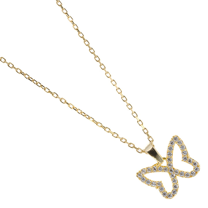 This necklace features a dainty chain of sterling silver on 18K gold plate with a butterfly pendant adorned with sparkly CZ diamonds. The necklace length is 16" with a 3'' extender, and the pendant is 0.5'' high and 0.5'' wide.