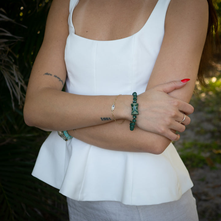 The Green Spiral Beaded Bracelet-Green by Ebru Jewelry is a captivating and enchanting accessory. This unique chunky bracelet combines green crystal beads, gold hematite spacers, a mystical big green eye Nepal bead, and a whimsical brass spiral charm. The eye bead symbolizes protection and intuition, while the spiral charm represents the continuous journey of self-discovery. The bracelet size is 6.5 inches.