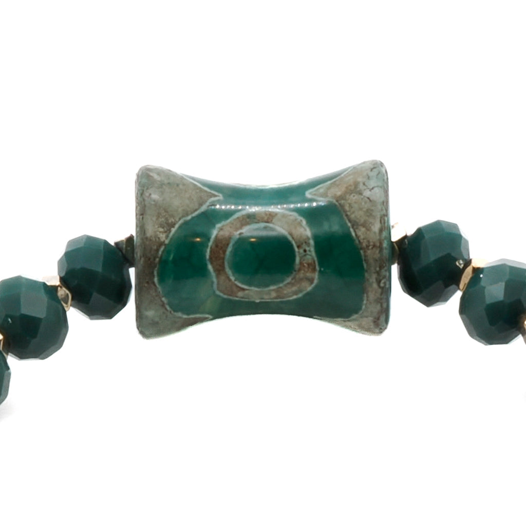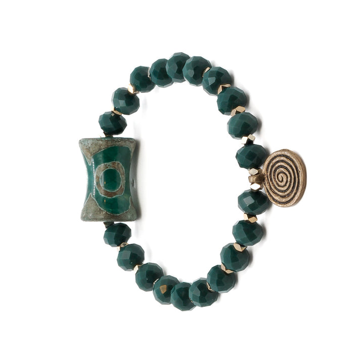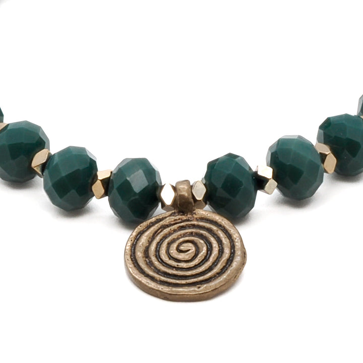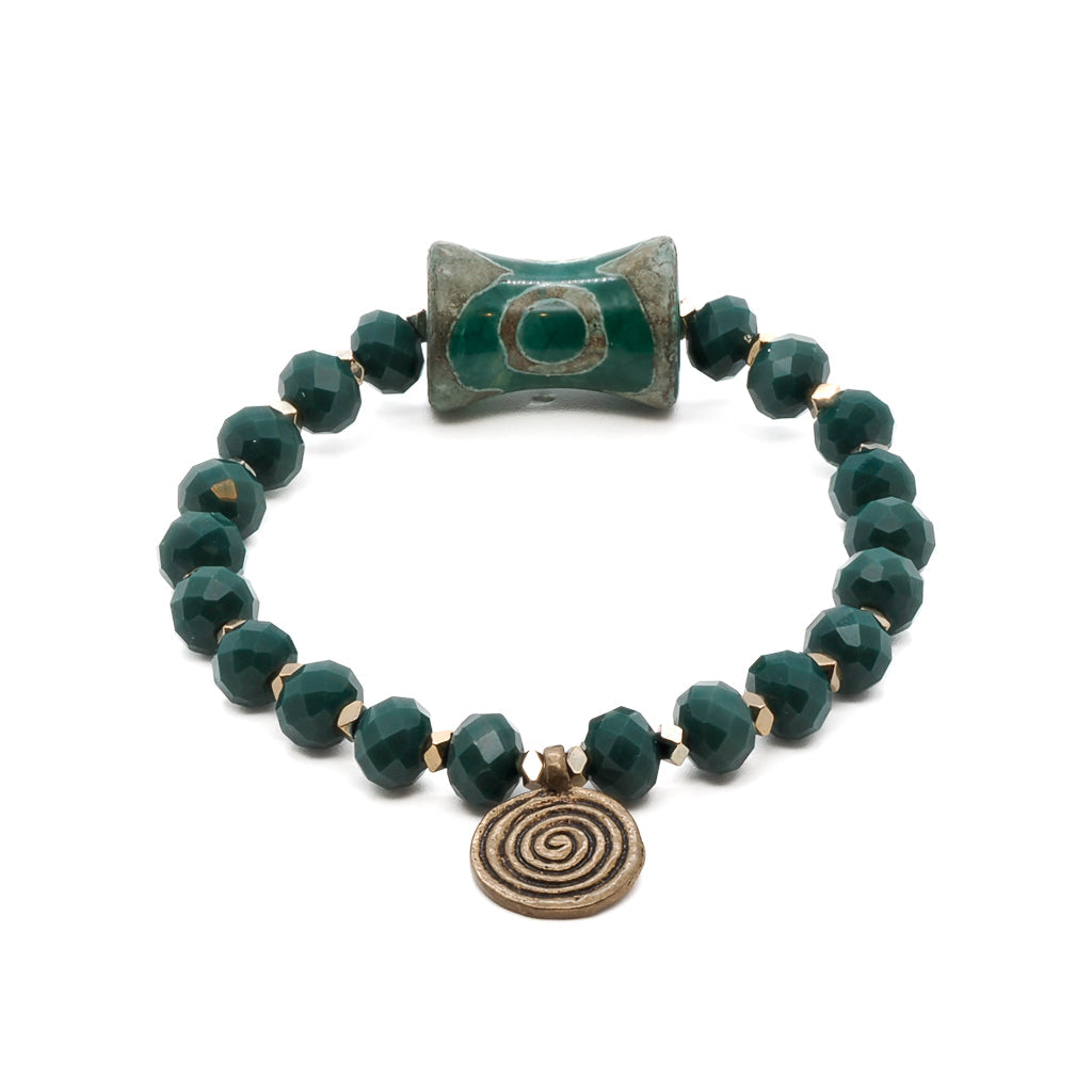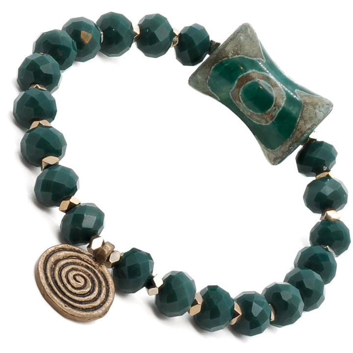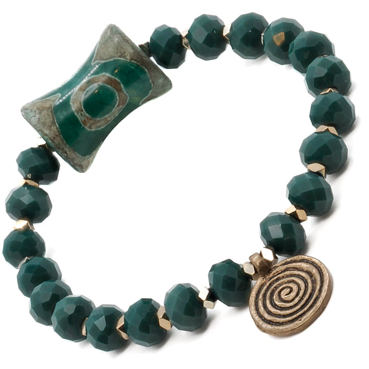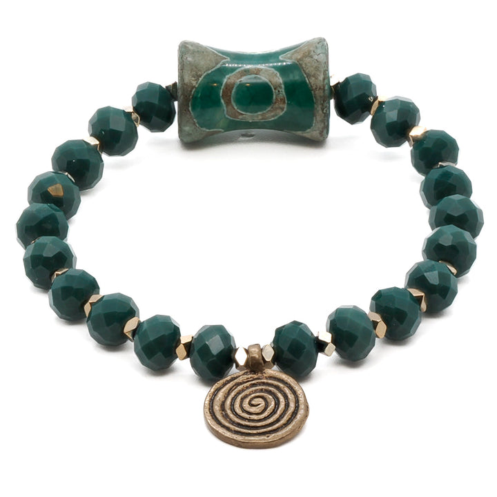 This bracelet features green crystal beads, gold hematite spacers, a big green eye Nepal bead, and a brass spiral charm. It is 6.5 inches in size.