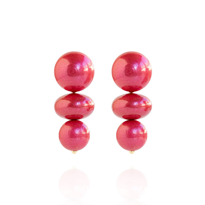 These Nola Earrings by Saule Label in Coral Sunset are a stunning example of postmodern design with a sculptural twist. They feature three distinct spheres, each varying in shape and size, creating a captivating visual effect. The vibrant color and unique form combine a contemporary edge with timeless elegance, making them a perfect accessory for those who want to make a bold, sophisticated statement. These handmade earrings are designed to be a conversation starter.