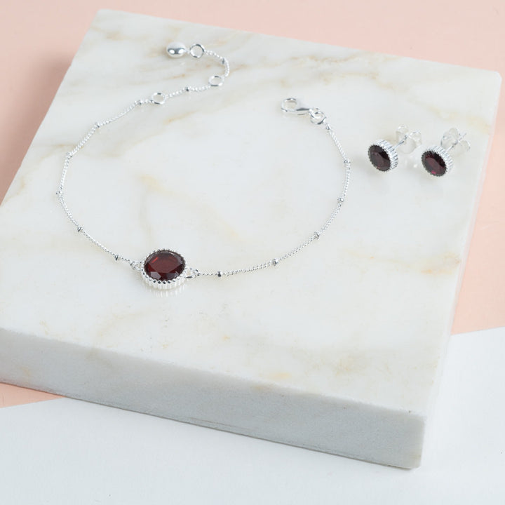 This Barcelona January Birthstone Bracelet with Garnet by Auree Jewellery is a delicate and symbolic piece. The rich red garnet, associated with peace, prosperity, and vitality, is elegantly set in a fluted silver frame and paired with a classic beaded chain. With its adjustable length and subtle silver nugget detail, this bracelet is both versatile and meaningful, celebrating January birthdays or personal milestones.