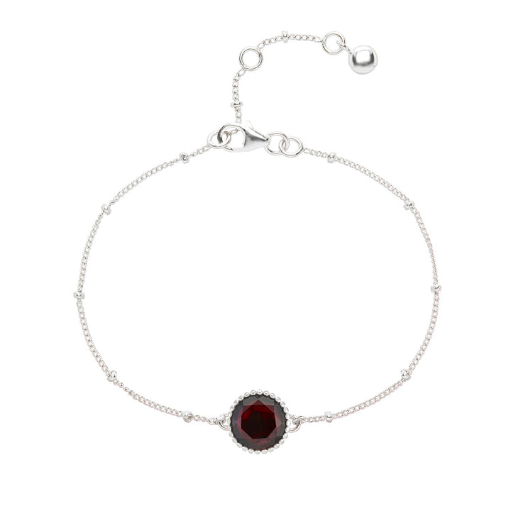 Sterling silver beaded bracelet with natural garnet gemstone in fluted setting. Adjustable length: 16cm, 17.5cm, or 19cm.