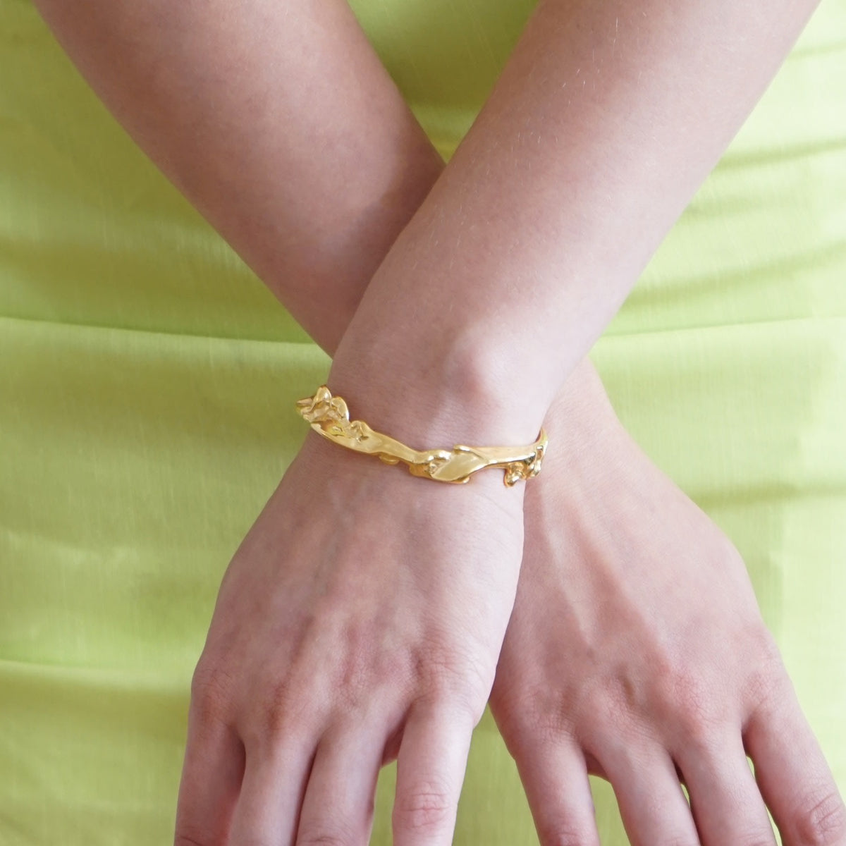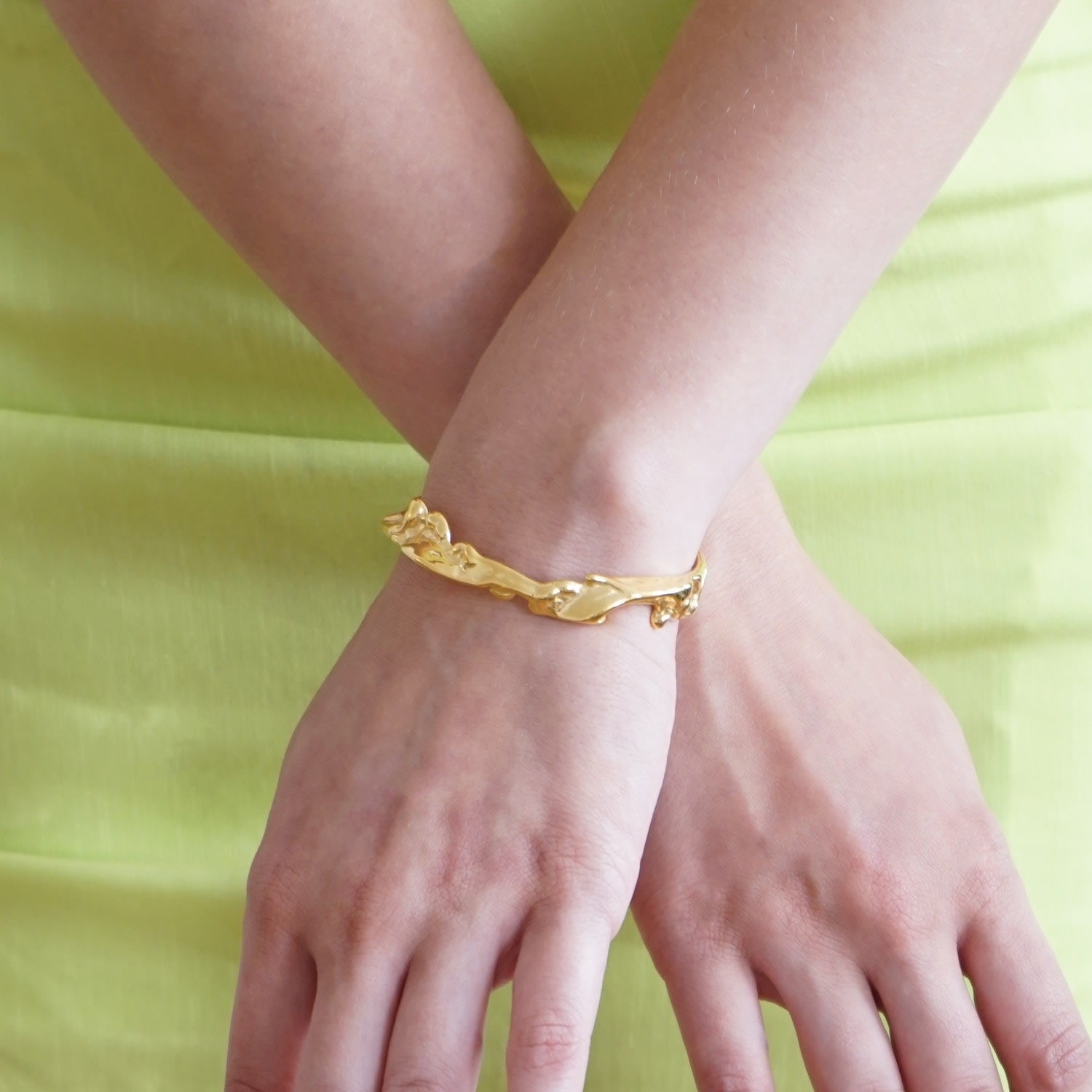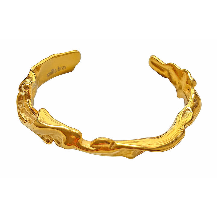 This cuff bracelet is made from recycled stainless steel and is gold-dipped. Each piece is unique.