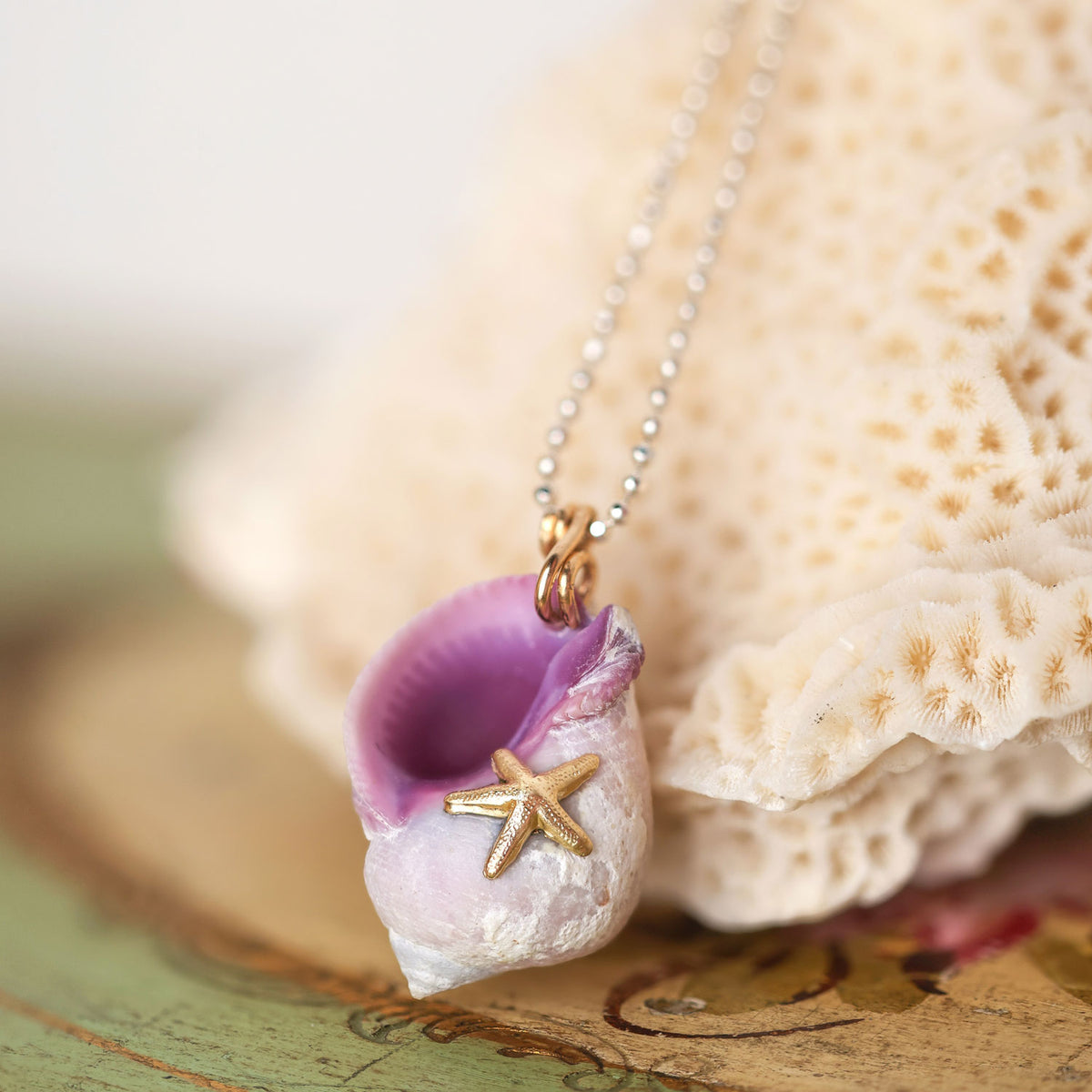 This necklace is made from recycled 925 sterling silver and features a fossilized one-of-a-kind shell and a 14K gold-filled sea star.