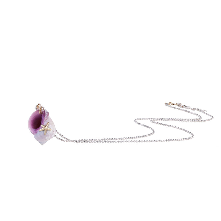 The Fossilized White And Purple Sea Shell Pendant Necklace by Oanasavu.creations is a truly unique and ethereal accessory. The main feature is a one-of-a-kind fossilized shell with irregular shape and mesmerizing white and purple hues. The shell is a testament to time, telling a millions of years old story. The necklace is crafted from recycled sterling silver and features a delicate 14K gold-filled sea star.