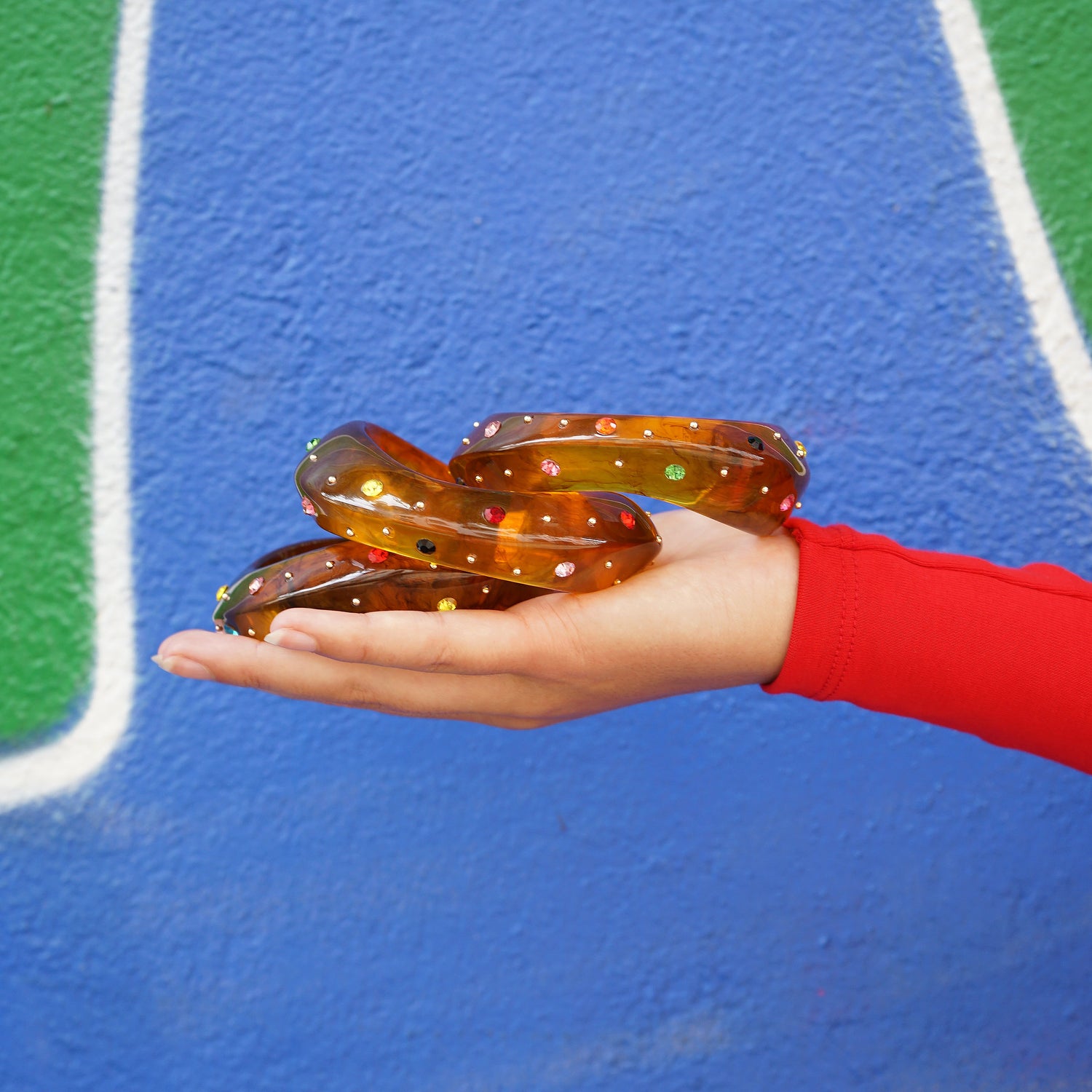 The Bangle Candy Amber by Smilla Brav is a sculptural piece where retro glamour meets playful rebellion. Crafted from recycled plastic in a rich amber swirl, it is dotted with vibrant glass gemstones. This bangle's organic curves and jewel-toned sparkle bring a bold attitude. Sustainably made and unapologetically loud, this unique accessory turns every gesture into a style statement.
