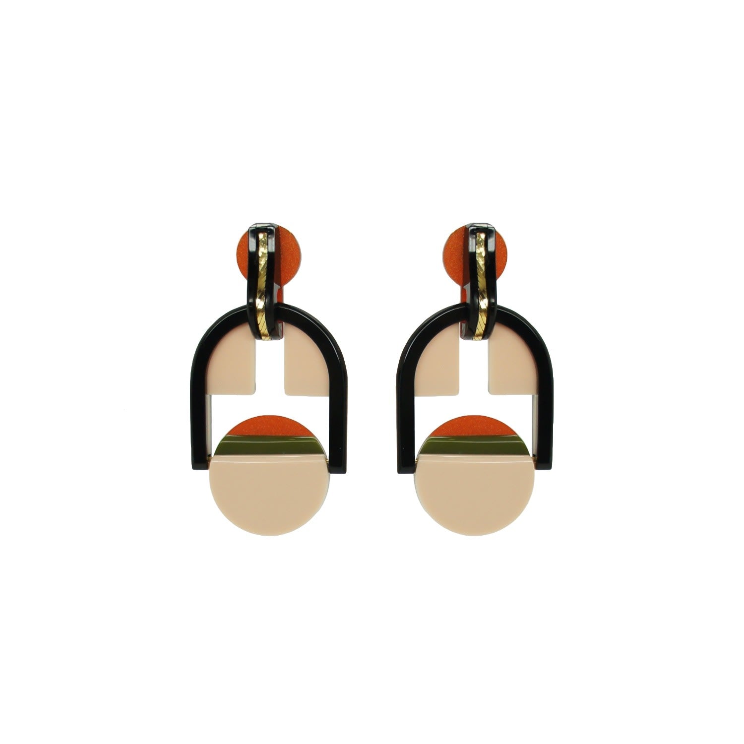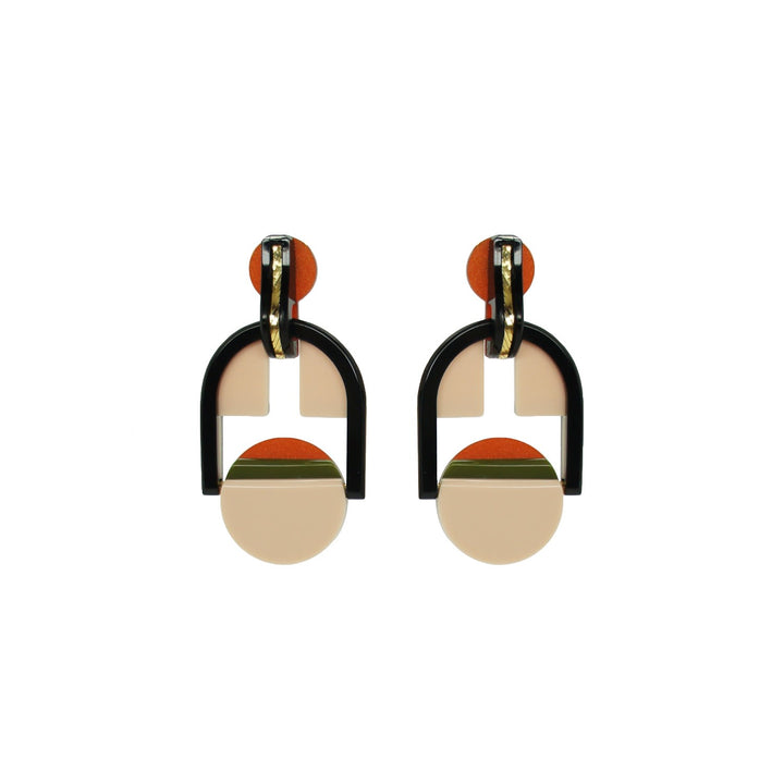 These handmade earrings are crafted from acrylic and metals with a golden finish.