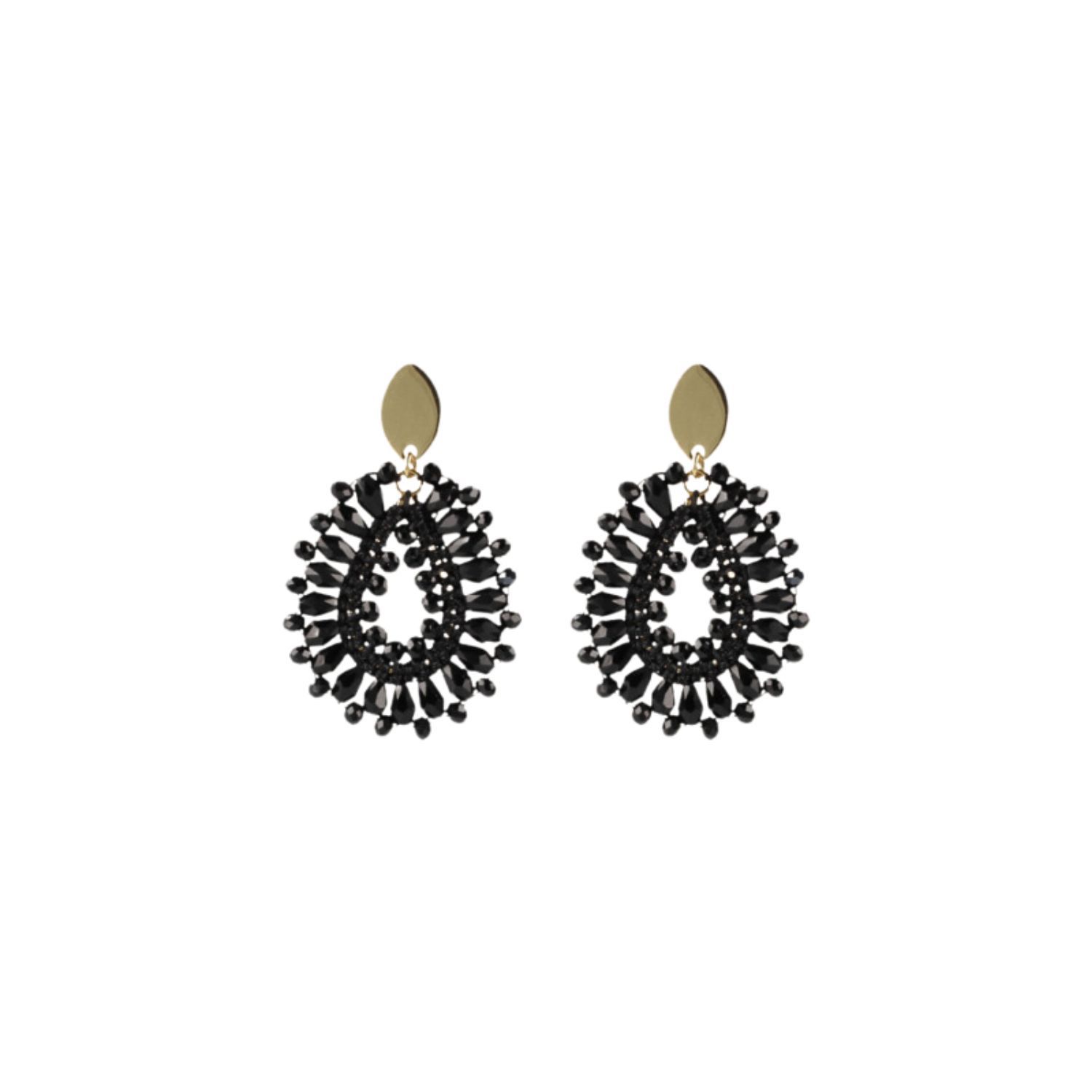 These earrings feature a black crystal-adorned leaf-shaped stud. The metal is not specified.