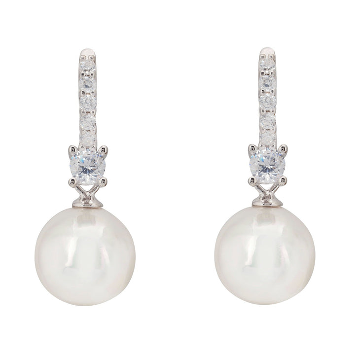 The Serenity Pearl Hoop Earrings Silver by Latelita are a timeless and elegant accessory. These petite huggie hoops are expertly crafted from 925 sterling silver and adorned with a single row of cubic zirconia. A prominent zircon gem anchors the design, from which a lustrous white pearl dangles. These earrings are a quintessential choice for a bride or as a timeless token for someone born in June.
