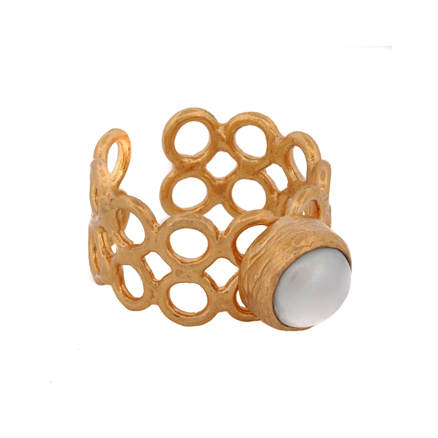 This adjustable ring is made from 24K gold-plated brass. It features a lustrous pearl stone and is adjustable in size.