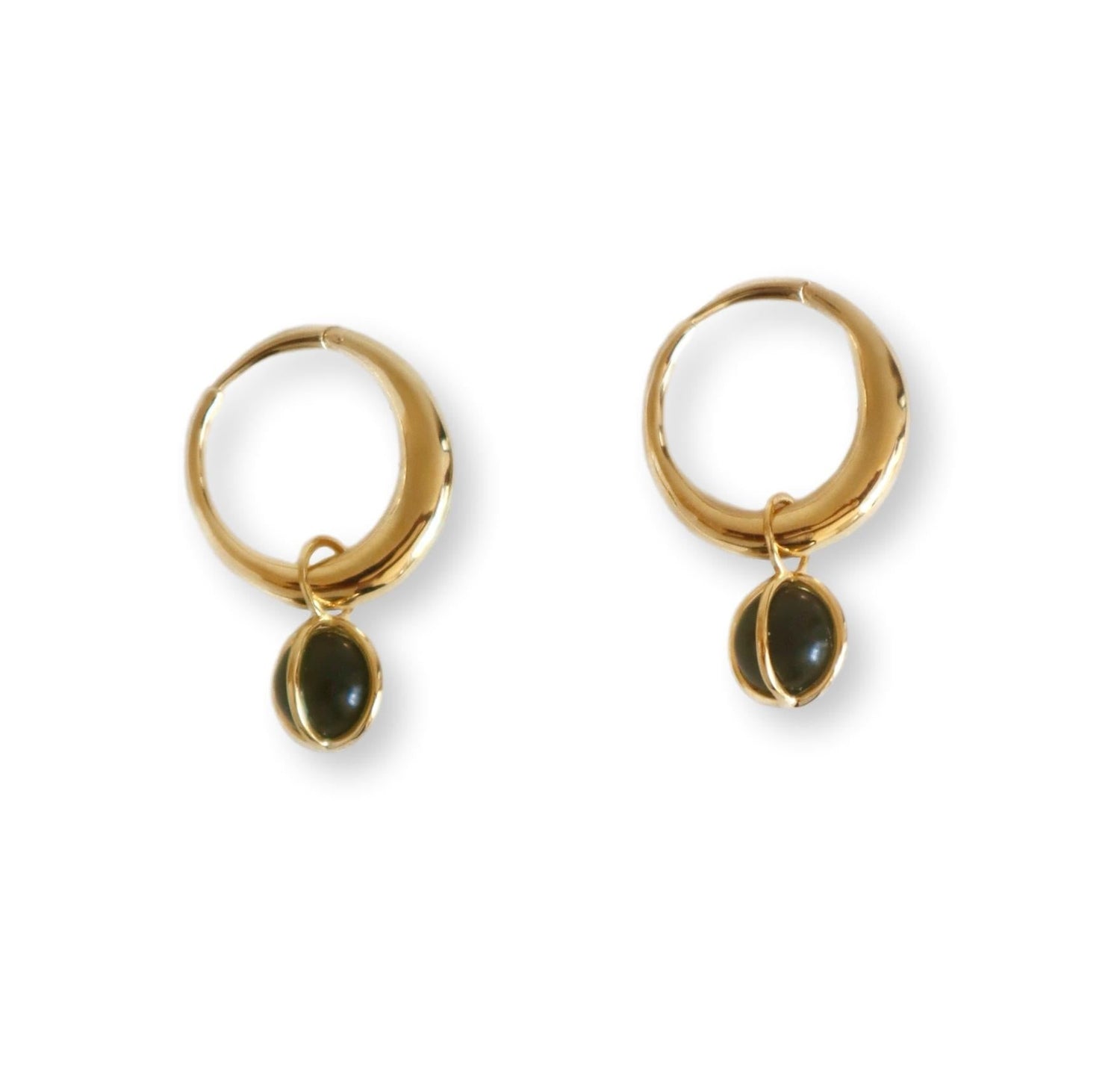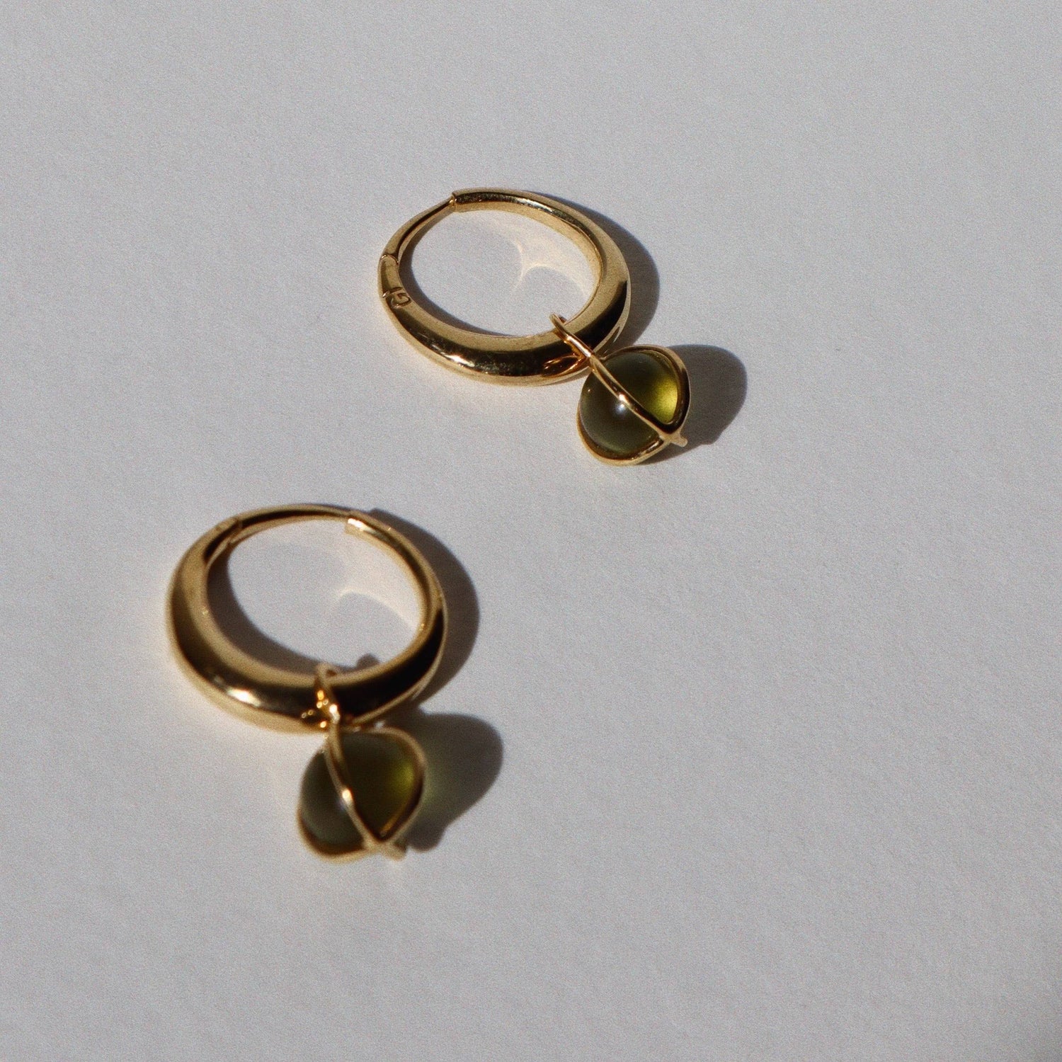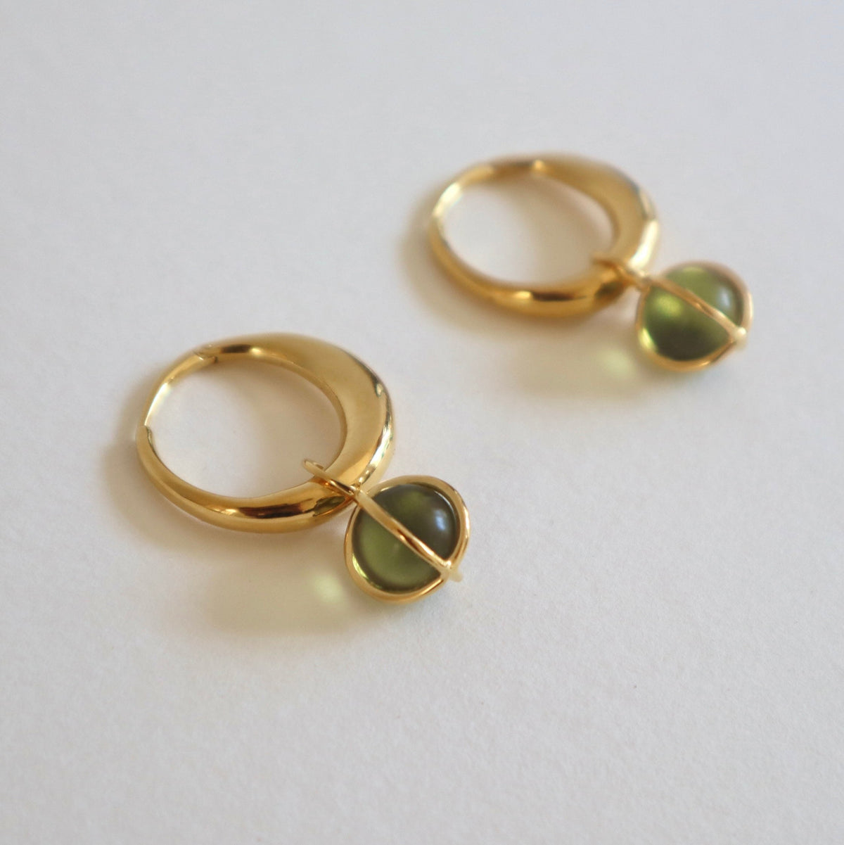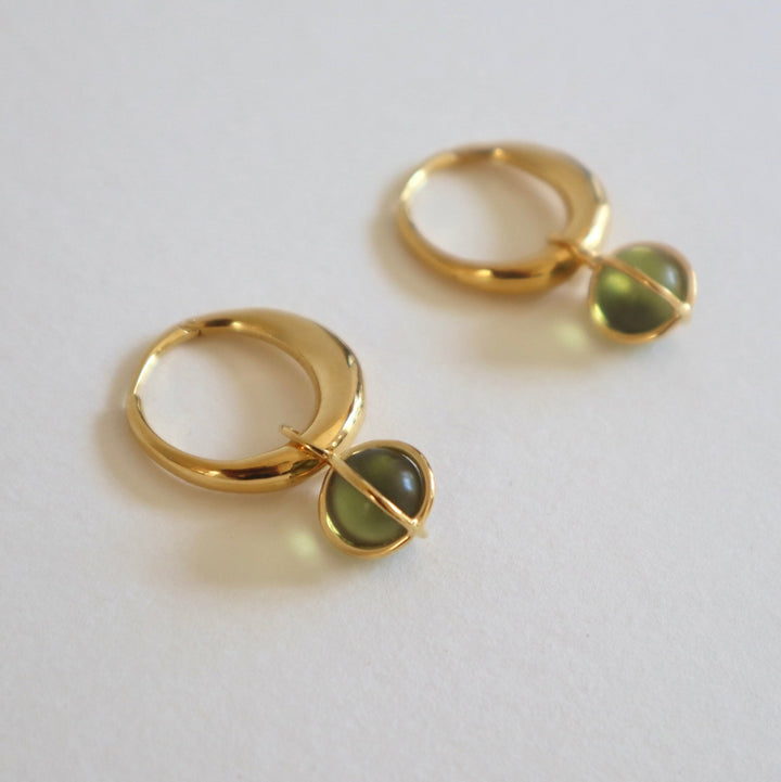 Crafted from 24k gold-plated brass, these hoops feature a green olive quartz. They have a total length of 20mm.