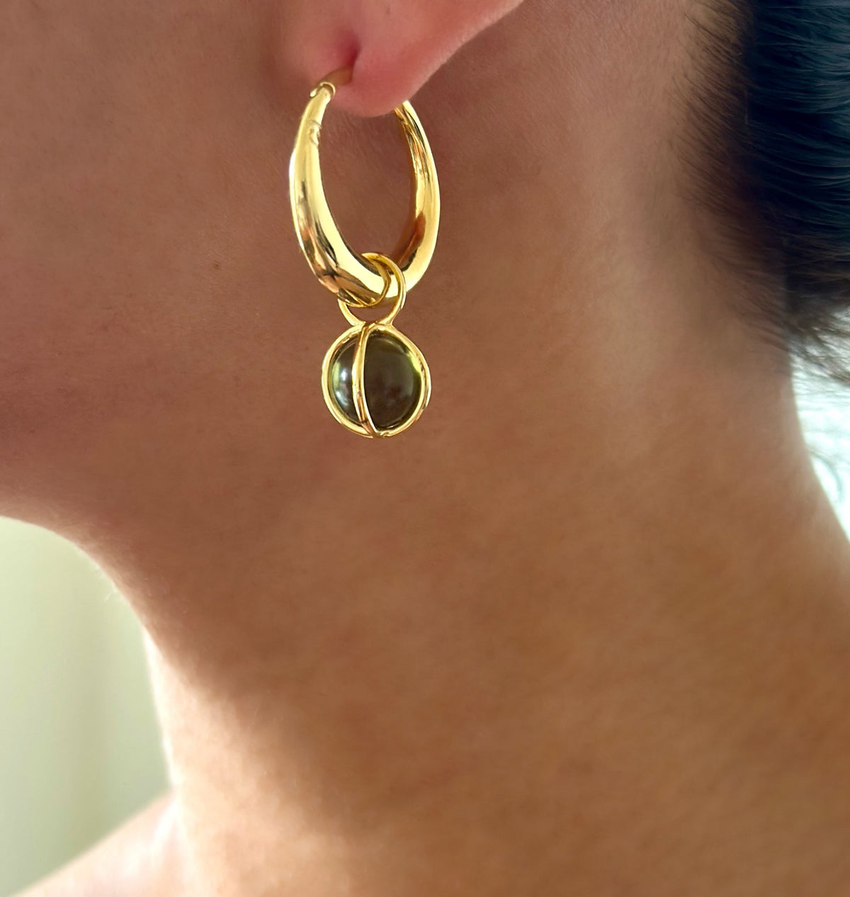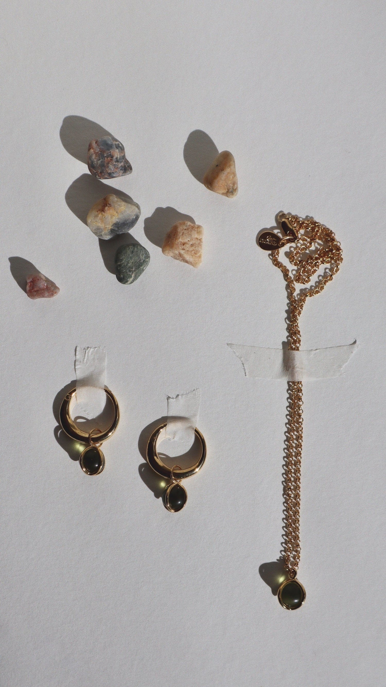 These Lucia Earrings by Gem Island are a magnificent ode to the moon, a celestial symbol of power and femininity. The elegant hoop design, gracefully extended by a green quartz, adds a touch of refined sophistication and ethereal charm. These versatile hoops can also be worn alone for a minimalist statement. The green quartz is said to bring self-confidence, good luck, and a calming vitality, allowing the wearer to radiate empathy and self-awareness.