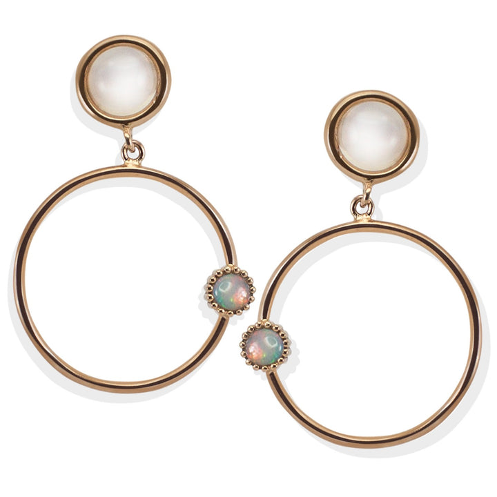 These hoops are handcrafted from sterling silver with rose gold vermeil plating. They are set with delicate moonstones and opal cabochons.