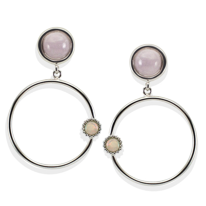 These hoops are handcrafted from sterling silver. They are set with beautiful kunzite stones and glittering opal cabochons.