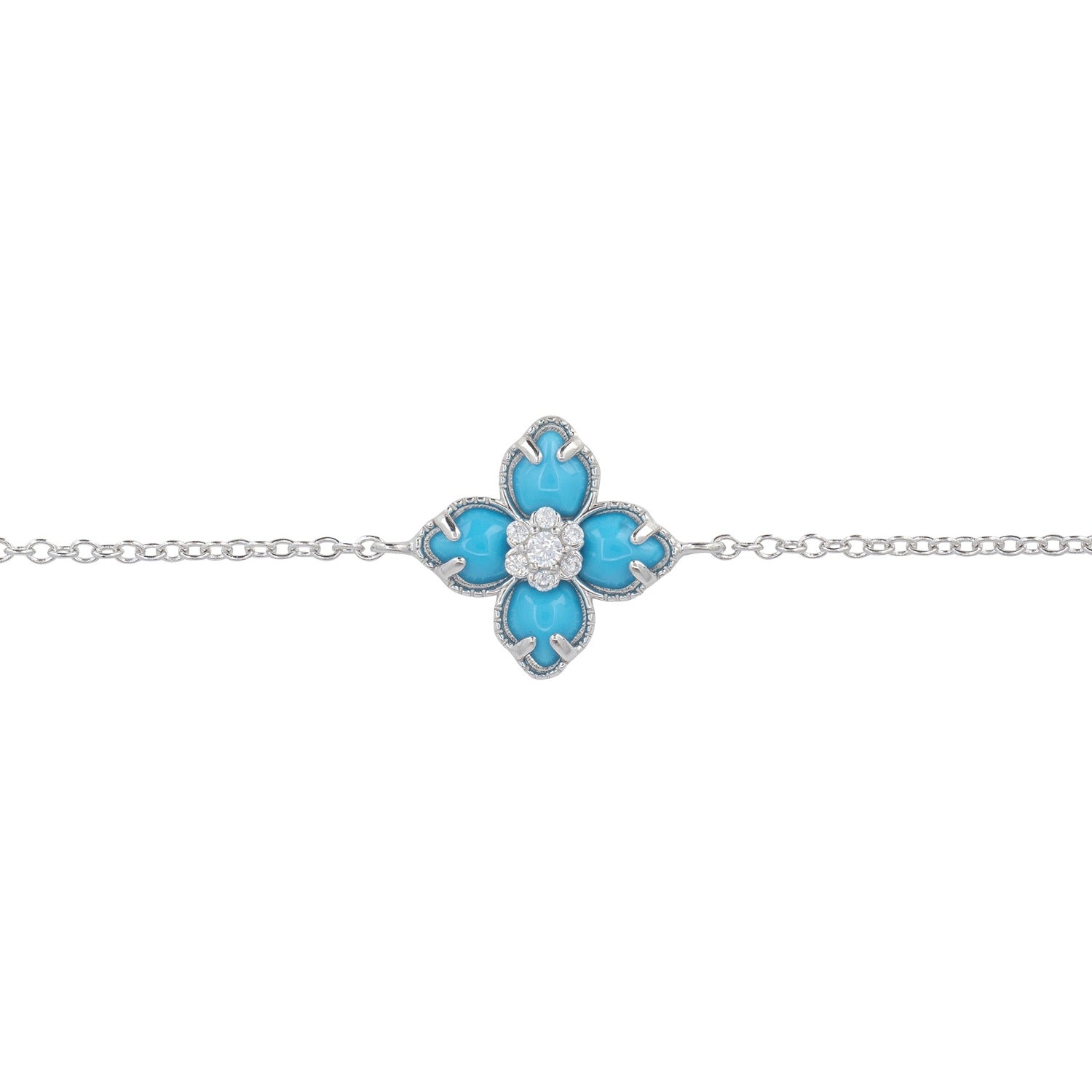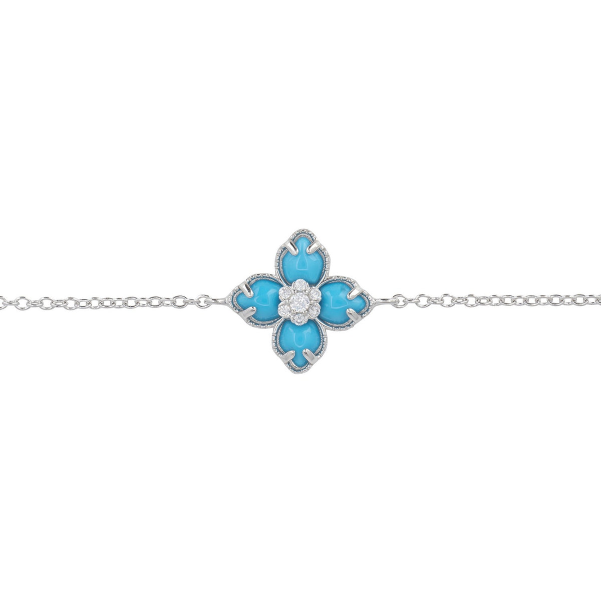 This bracelet is handcrafted in 925 sterling silver. It features turquoise and cubic zirconia. It has a clover shape.