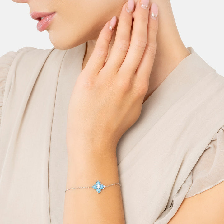This Flower Clover Turquoise Bracelet Silver by Latelita is a bright, stylish, and meaningful accessory. The clover, a sign of luck and protection, is inlaid with vibrant turquoise, which promotes friendship, courage, and positivity. The bracelet also features a glittering cubic zirconia center. Handcrafted from 925 sterling silver, this beautiful piece makes for a meaningful lucky charm and a thoughtful gift for any special occasion.