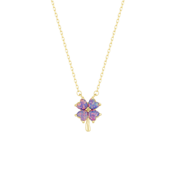 This necklace is crafted from 100% fine sterling silver and features pink and purple opal stones in a four-leaf clover design.