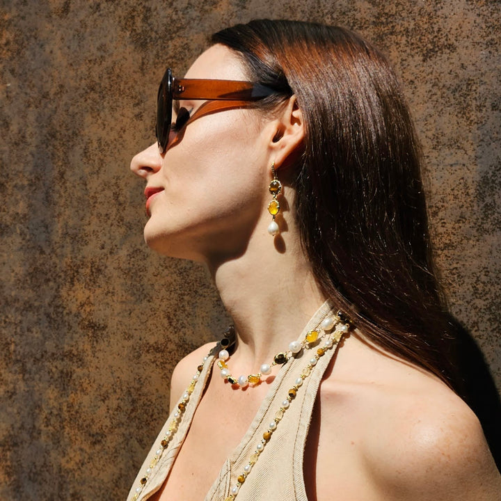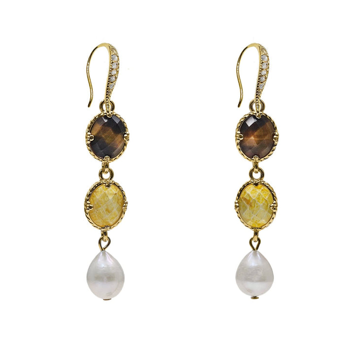 These dangle earrings are made with brown tiger eye stones and yellow quartz, set in a gold-toned setting. They also feature a freshwater pearl drop and a secure hook closure.