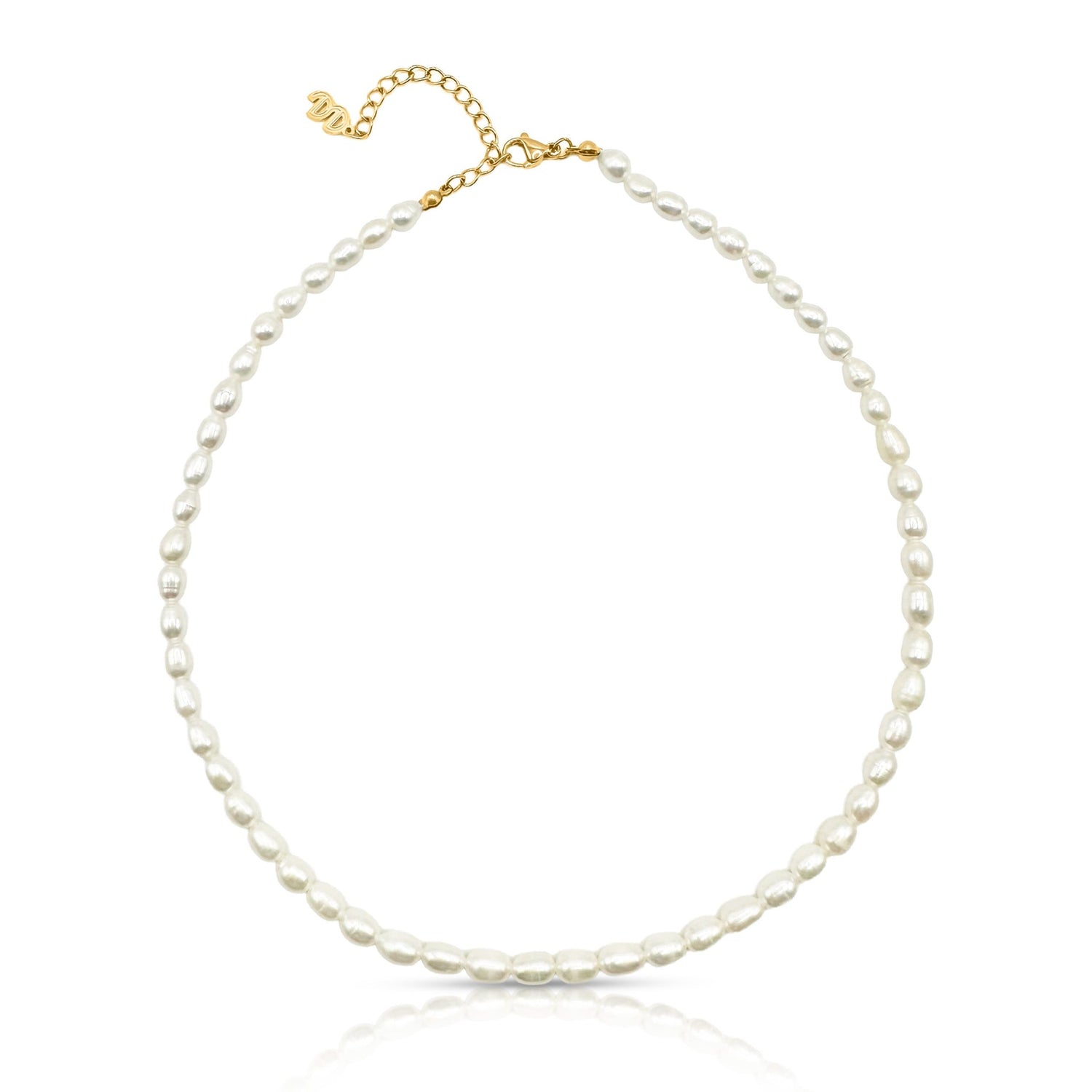 Freshwater pearls (5mm) with gold-plated stainless steel clasp and extension chain. Adjustable length.