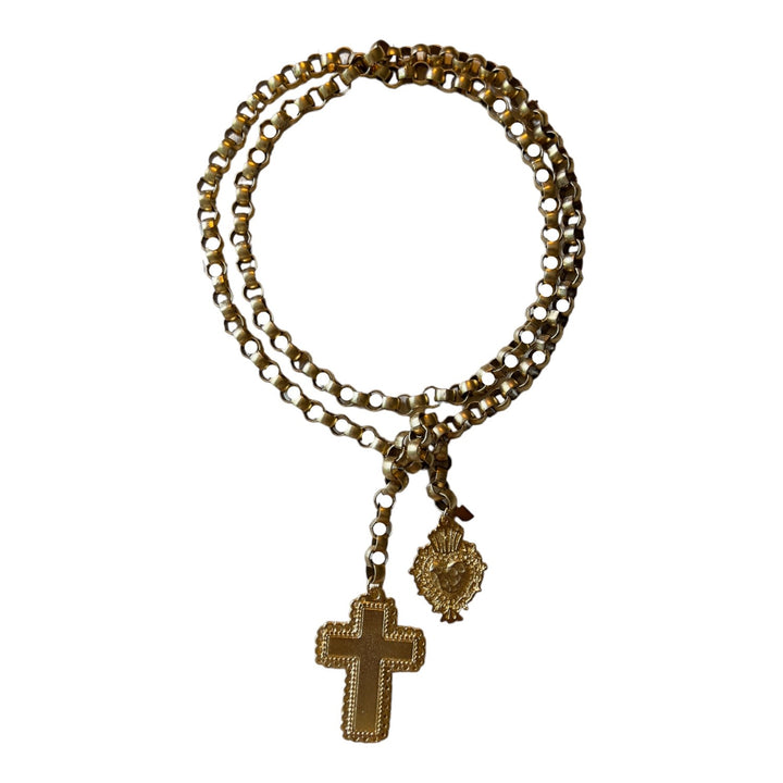 This necklace is 36 inches long and is made from 12k antiqued gold-plated steel rolo chain with 12k antiqued gold-plated steel cross and heart pendants.
