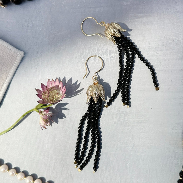 These earrings are crafted with black obsidian and feature a flower charm with a beaded tassel.