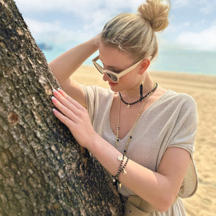 These Black Obsidian Beaded Tassel Earrings by Farra are a feminine and pretty accessory. They feature black obsidian with a flower charm and a beaded tassel, making them a unique and elegant statement. These earrings are perfect for matching with a midi dress or knitwear for a day-to-night look.