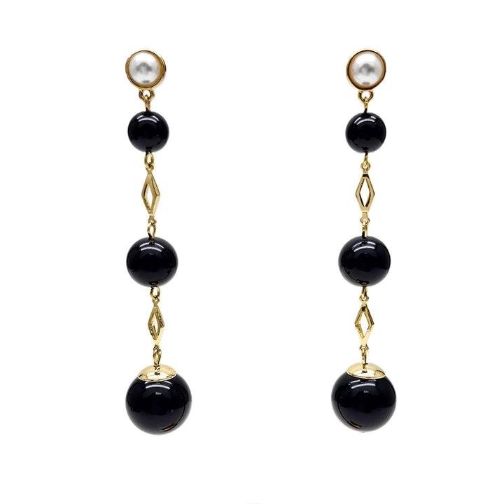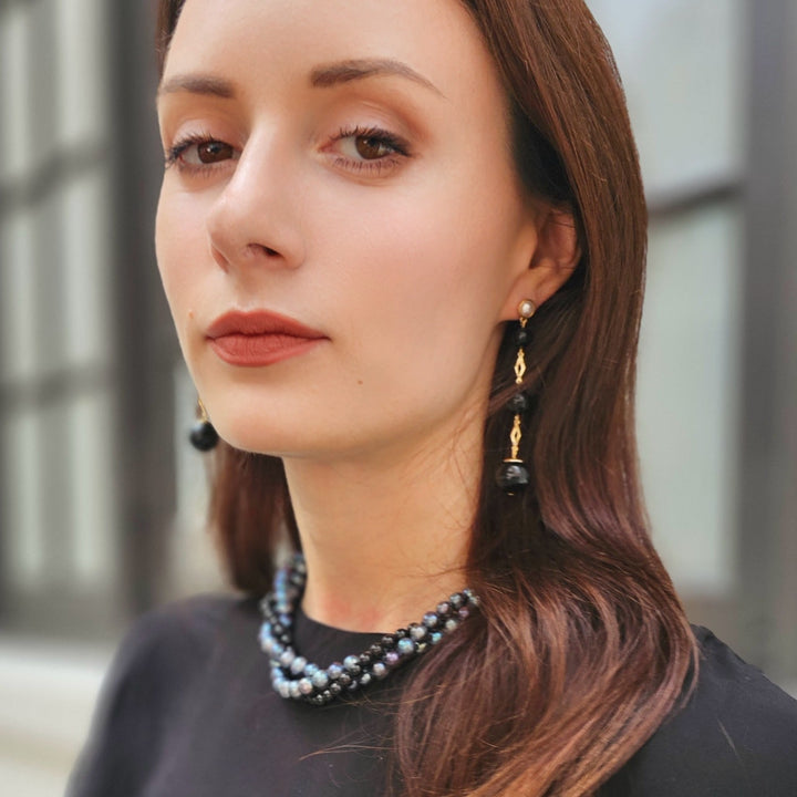 These dangle earrings are made of natural black obsidian and 14K gold plated brass. They are shoulder-length.