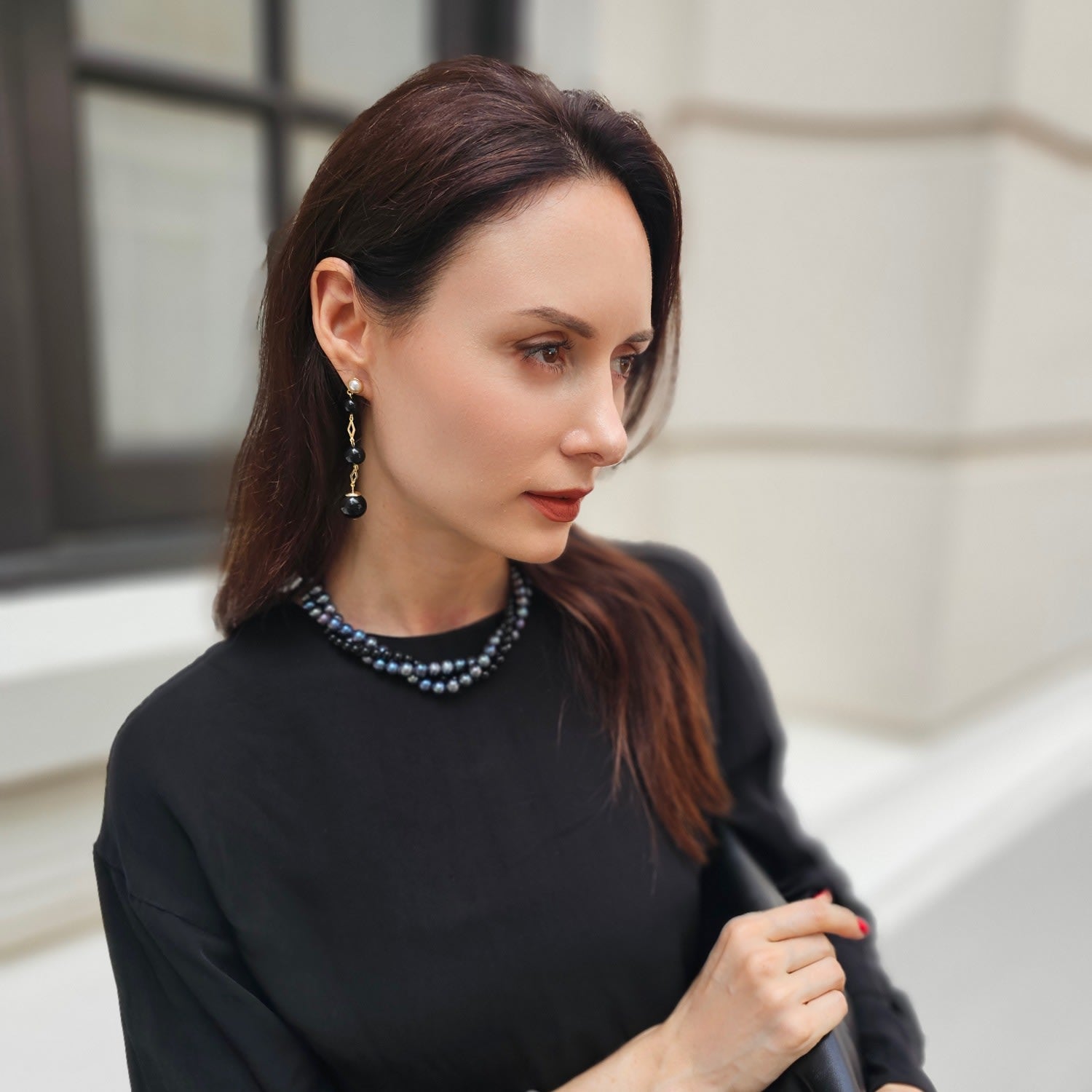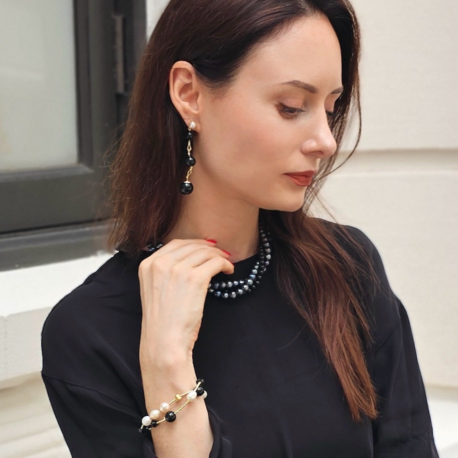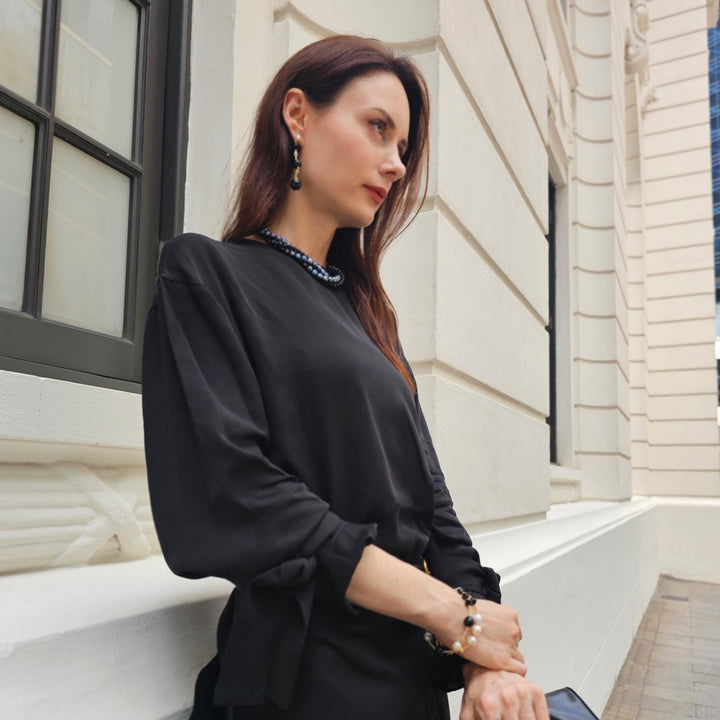 These Black Obsidian Dangle Earrings by Farra are a stunning and powerful accessory. Crafted from high-quality natural black obsidian, they are known for their protective and emotionally healing properties. The shoulder-length design adds an elegant touch, allowing them to sway gracefully with your movements. Made with 14K gold plated brass, these versatile earrings are more than just a fashion statement; they are a must-have addition to any jewelry collection.