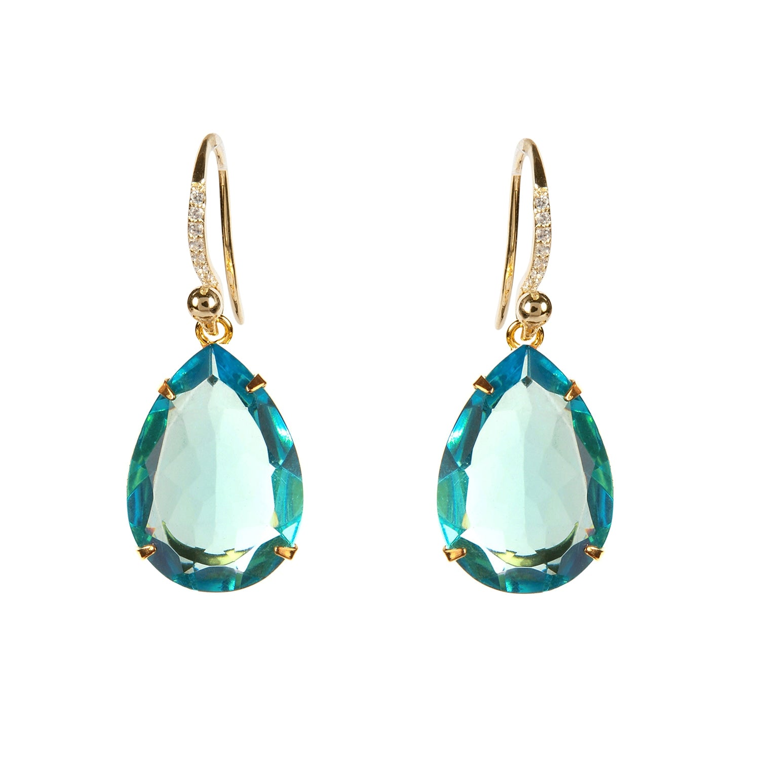 These earrings are made of semi-precious blue quartz stones and 14k gold plating. They have a fish hook closure.