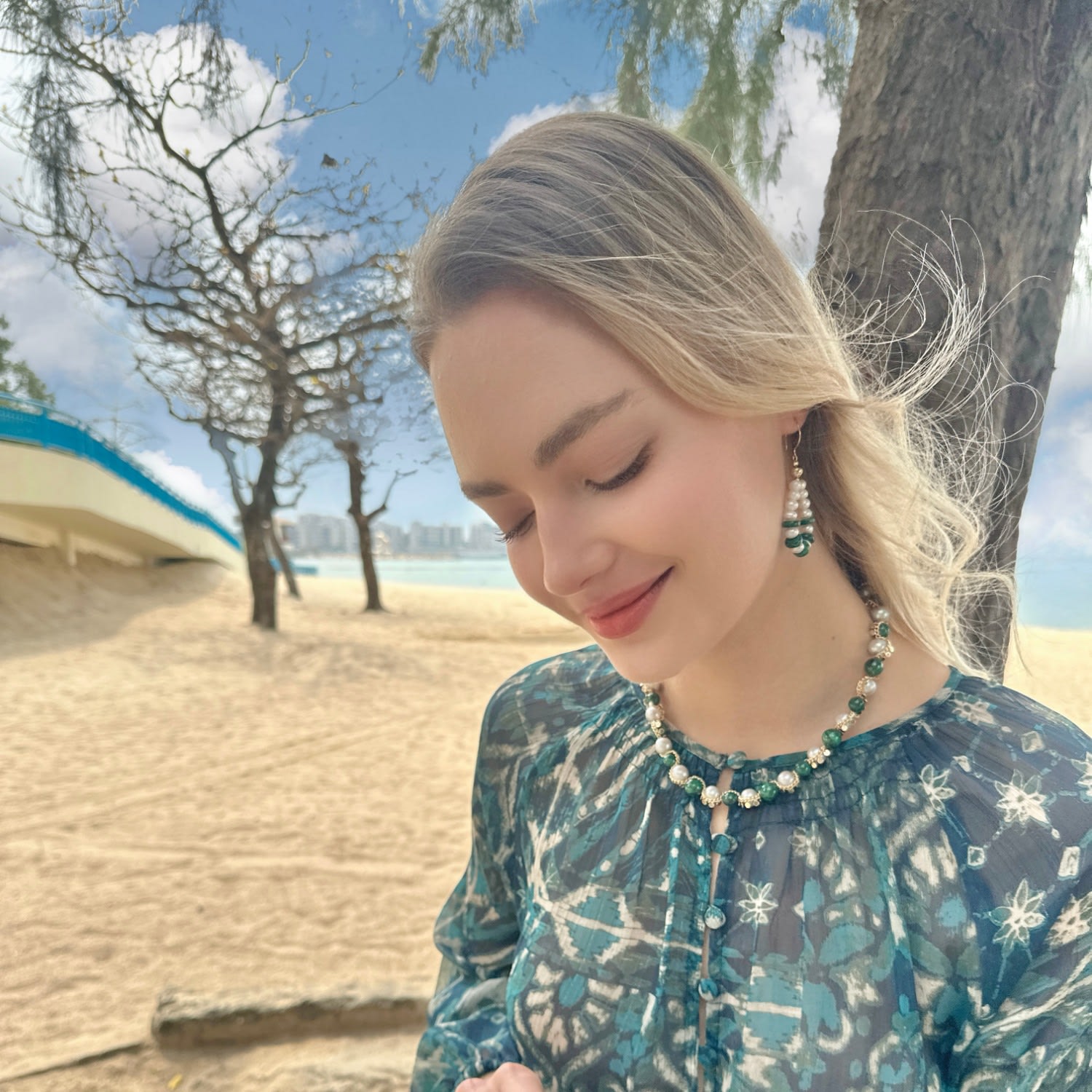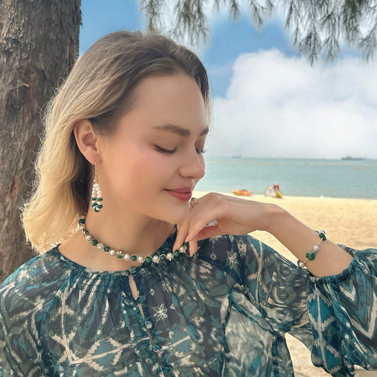 These Handcrafted Teardrop Freshwater Pearls With Malachite Earrings by Farra are a stunning blend of timeless elegance and natural beauty. Each earring features a lustrous, teardrop-shaped freshwater pearl that reflects light beautifully. Complementing the pearls are vibrant green malachite beads, which add a striking pop of color and a sense of nature's beauty. The contrasting hues and unique patterns make these earrings truly eye-catching.