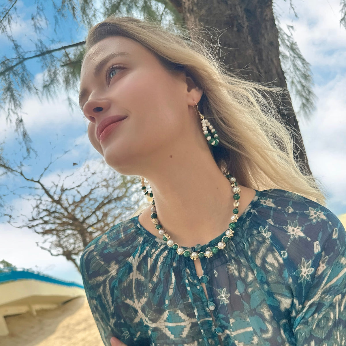 These earrings are handmade from 14K gold plated brass. They feature teardrop-shaped freshwater pearls and natural malachite beads.