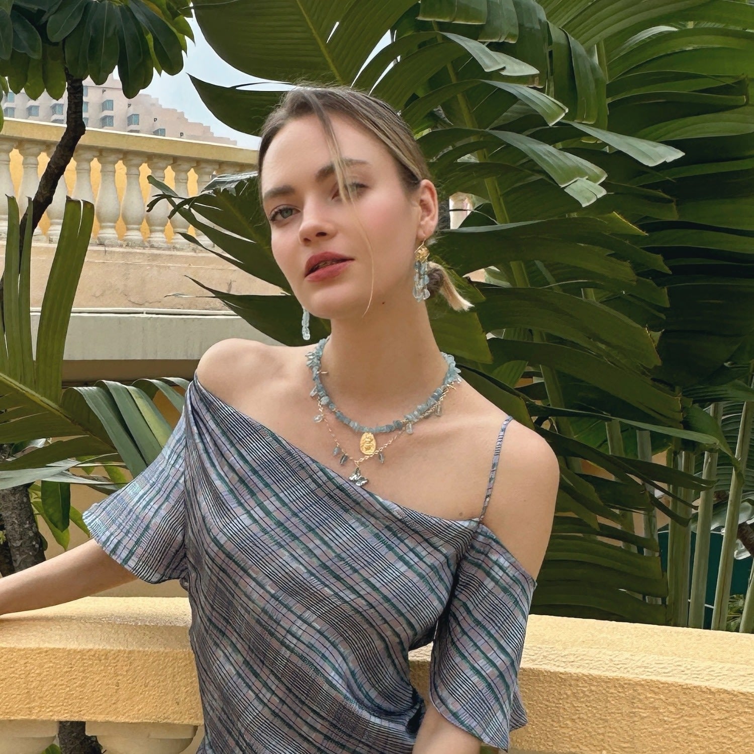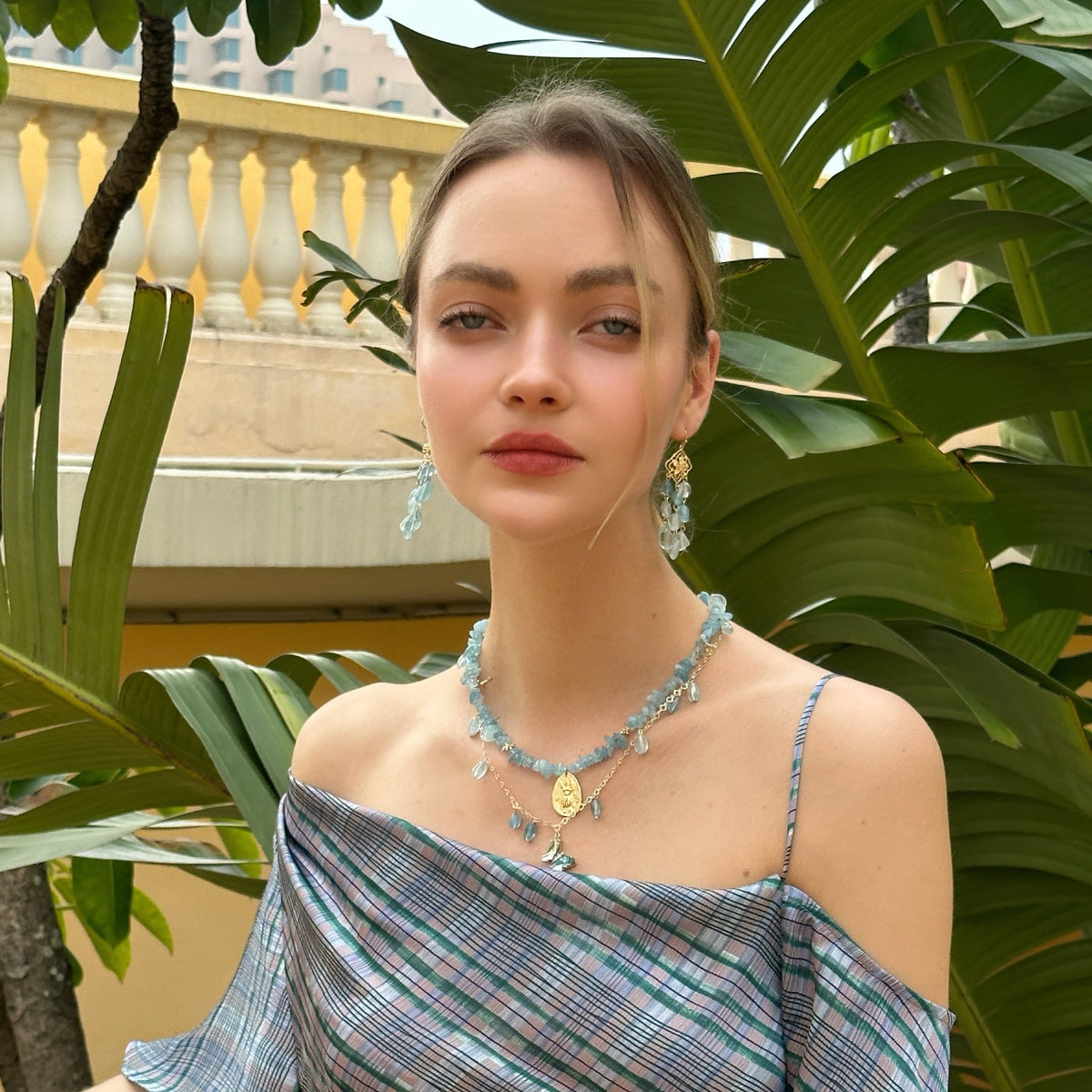 These Bohemian Aquamarine Beaded Tassel Earrings by Farra are a perfect accessory for adding free-spirited charm to your summer collection. They feature cascading strands of natural aquamarine beads with a playful tassel design. These earrings capture the essence of bohemian style and evoke a carefree and vibrant energy. They pair beautifully with flowy dresses and other boho-inspired ensembles, making them ideal for a beach party or music festival.