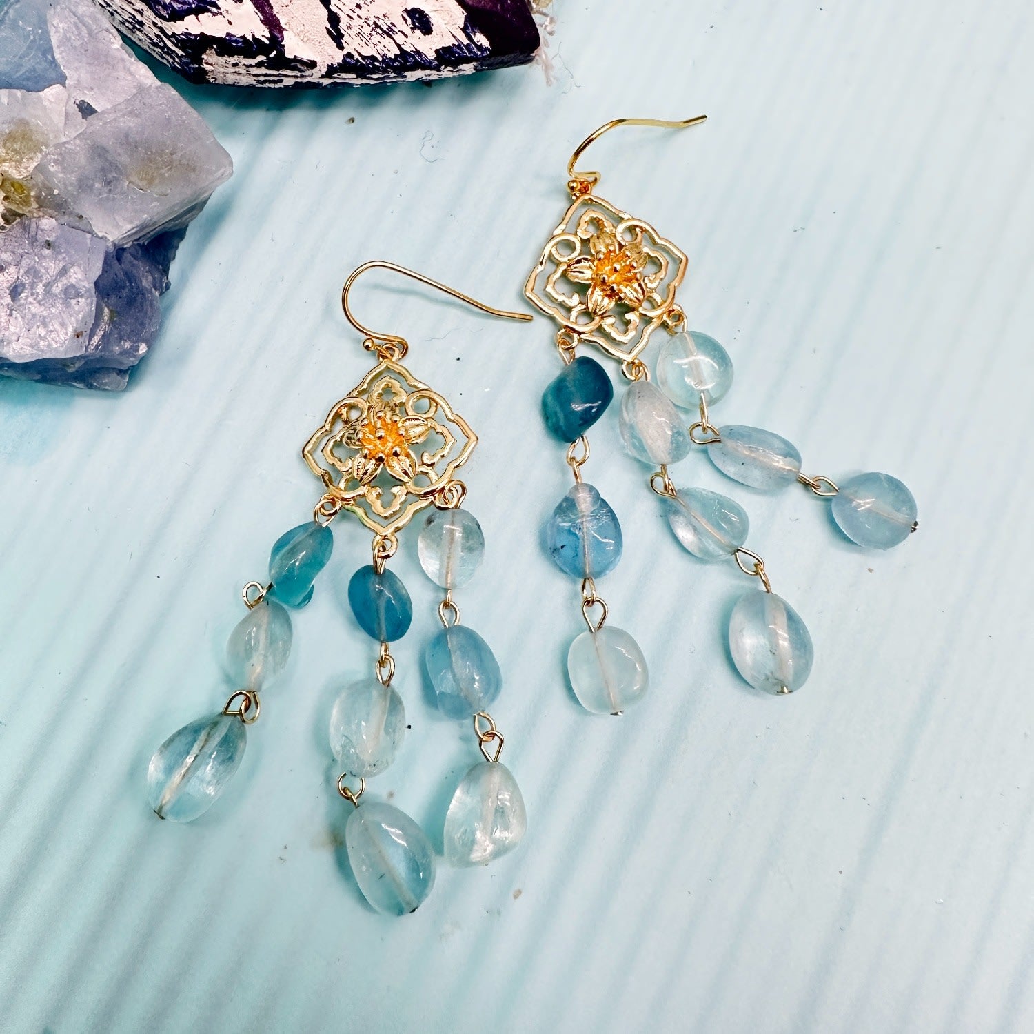 These earrings are crafted from 14K gold-plated brass and feature natural aquamarine beads in a tassel design.