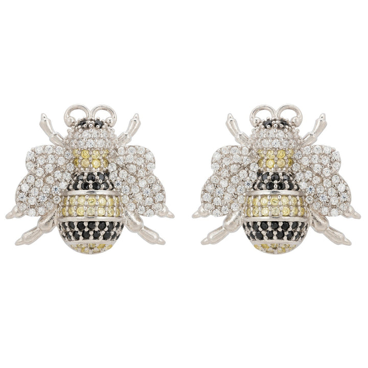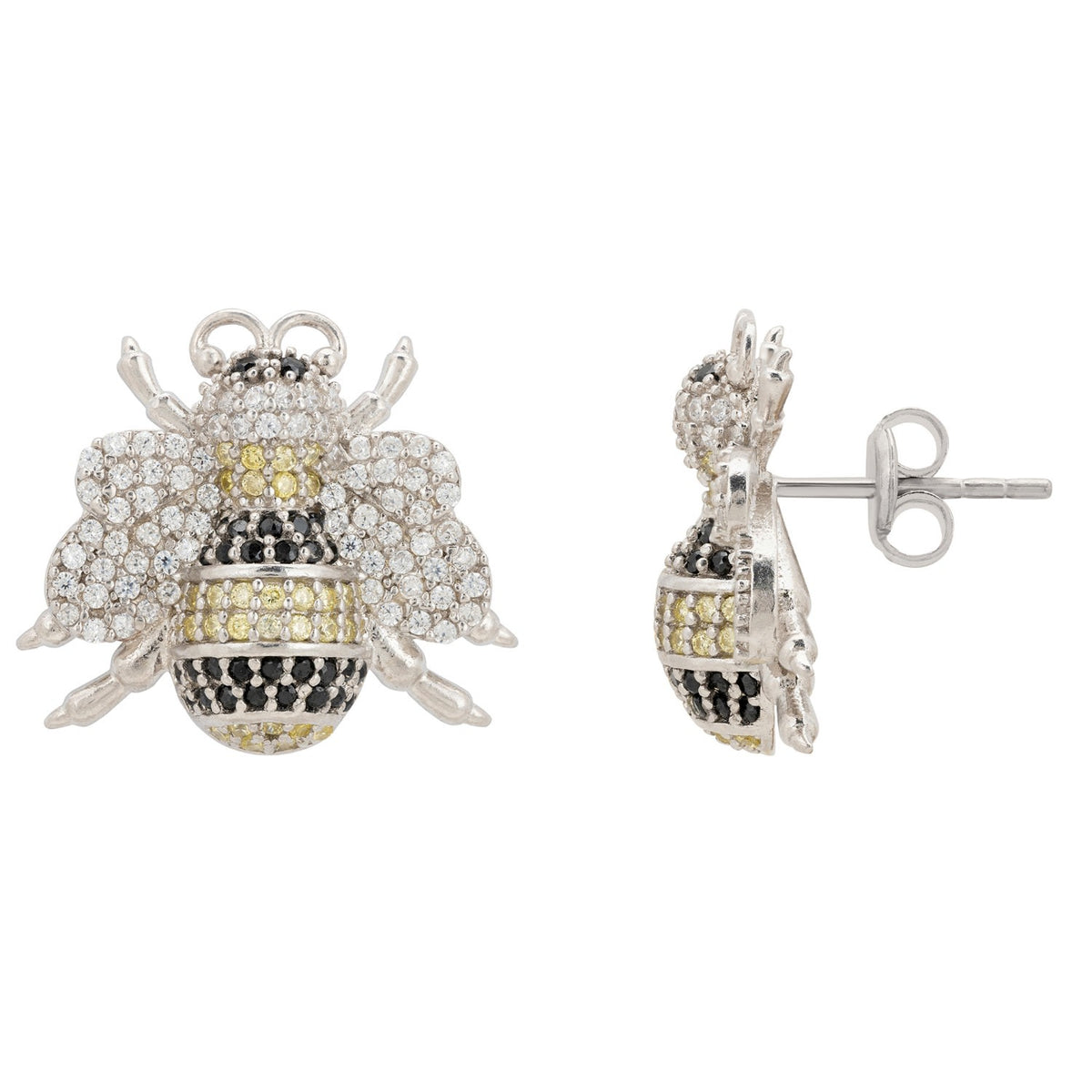 These stud earrings are handcrafted from 925 sterling silver. They feature a bevelled bumble bee design with handset micro-pavé AAA-grade black, yellow, and white cubic zirconia. They have a post back and butterfly fastening.