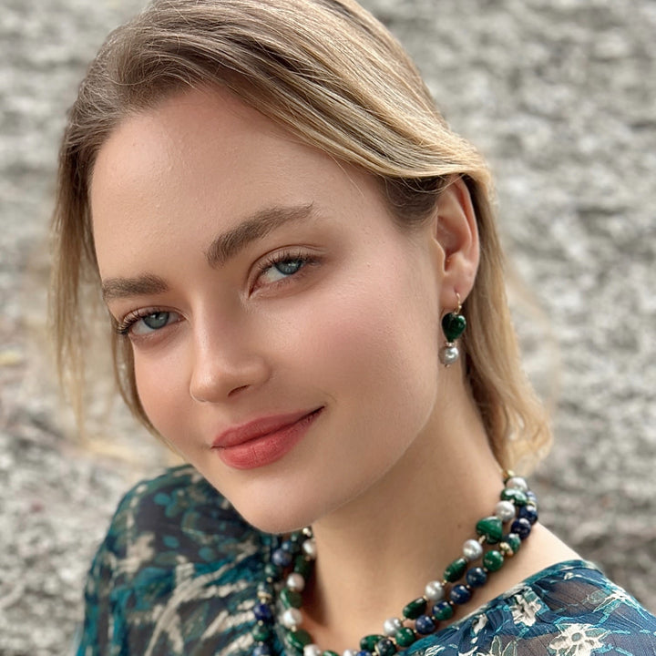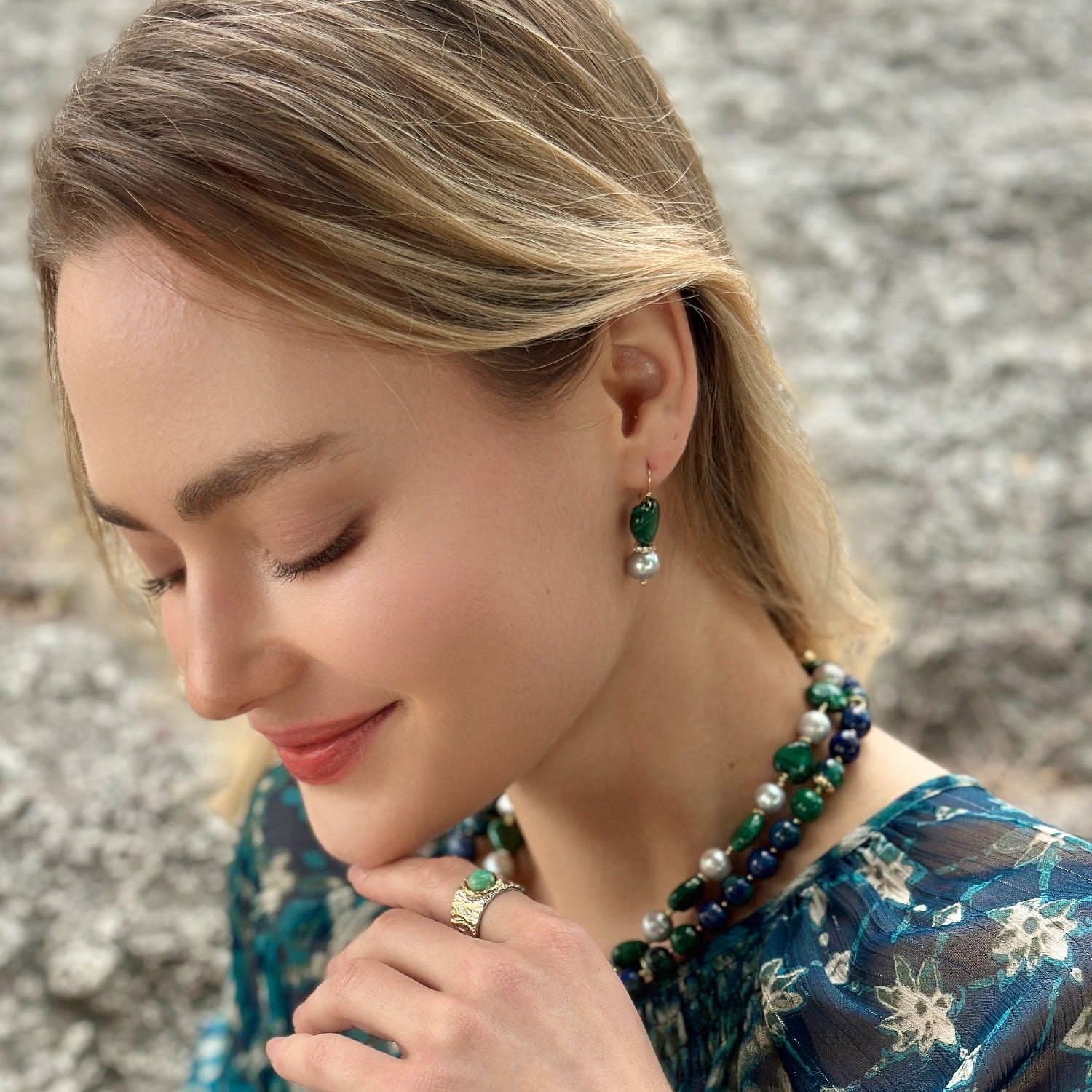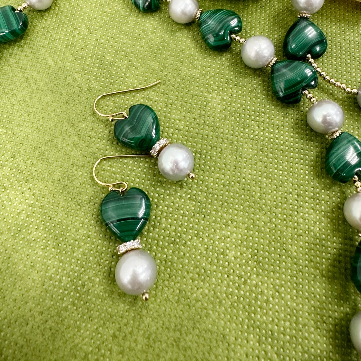 These earrings feature natural malachite hearts, gray freshwater pearls, and zircon stones. They are crafted from 14K gold-plated brass.