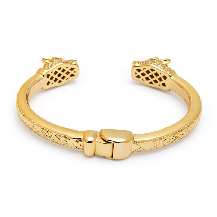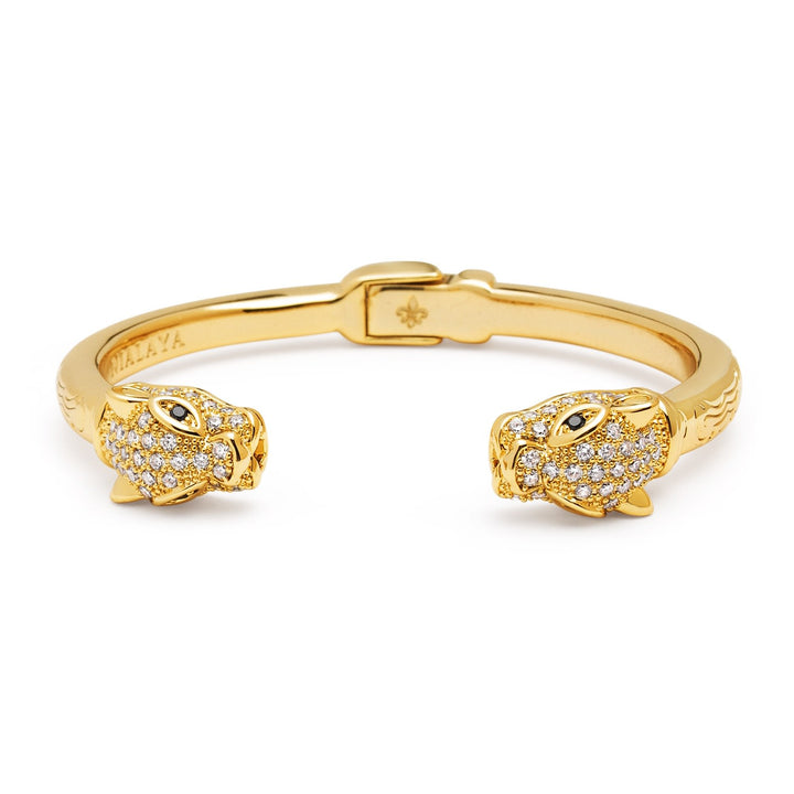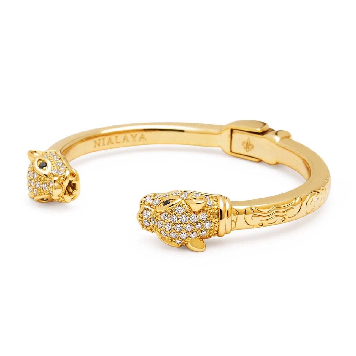 This Women's Cz Panther Bangle In Gold by Nialaya is a stunning, one-of-a-kind accessory. The bangle is crafted from Brass with lustrous gold plating and is adorned with hand-set cubic zirconia diamonds. The panther, a long-revered symbol of protection, guardianship, and courage, adds personality to both casual and formal looks. This is a must-have for any jewelry lover's collection, celebrating both sleek design and powerful symbolism.