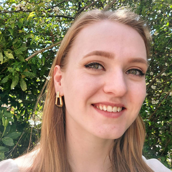 These Gold & Crystal Drop Clip On Earrings by Grossé are a statement accessory from the Art Deco Tribe series. These statement clip-on earrings are where chic and modern come together in the best way. They consist of a large geometric shape surmounted by a rectangle studded with Czech crystals. The earrings are 23 carat gold plated and measure approximately 30 x 20 millimeters. They are a bold, glittery, and modern accessory that is perfect for elevating your look.
