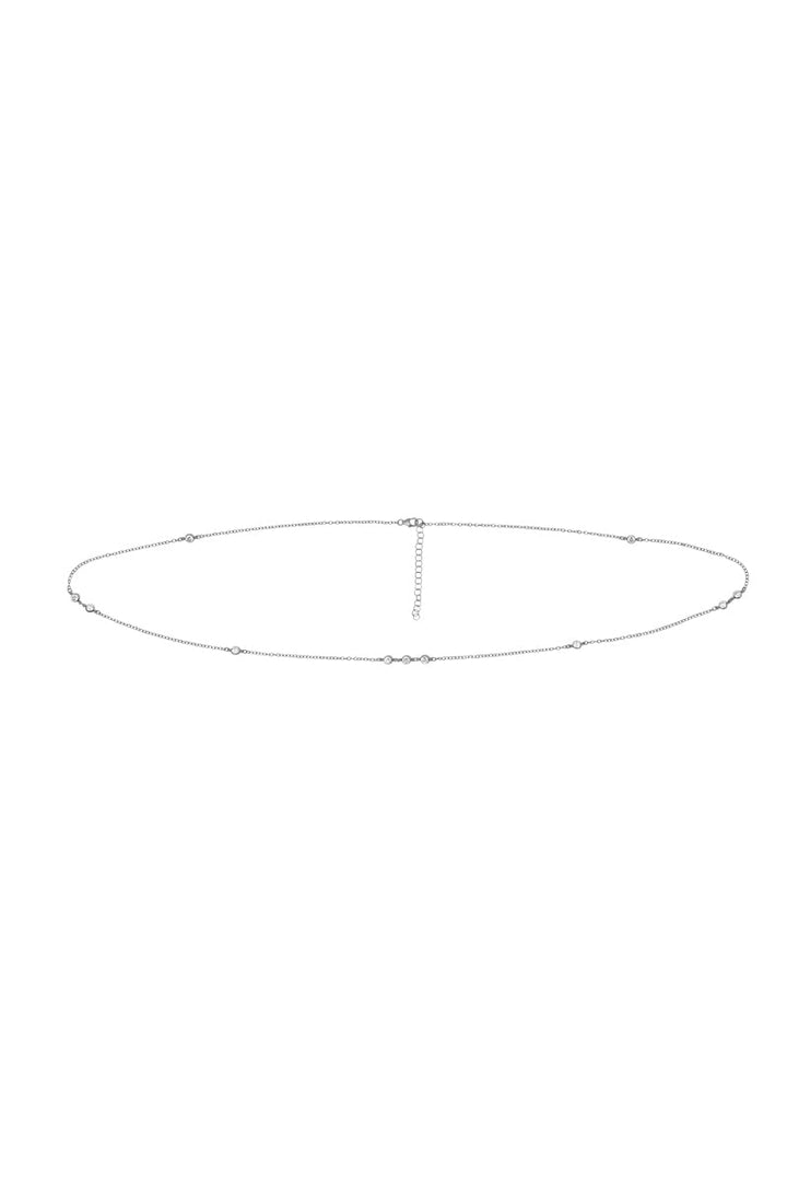 Sterling silver chain with white bezel-set cubic zirconia stones. Adjustable 30–32". Multiwear 5-in-1 design. Handmade in Los Angeles.