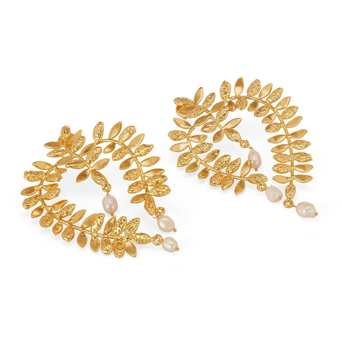 Handcrafted in brass with 22k gold plating. Designed with textured leaves and baroque pearl drops. Each piece may vary slightly due to artisanal process.