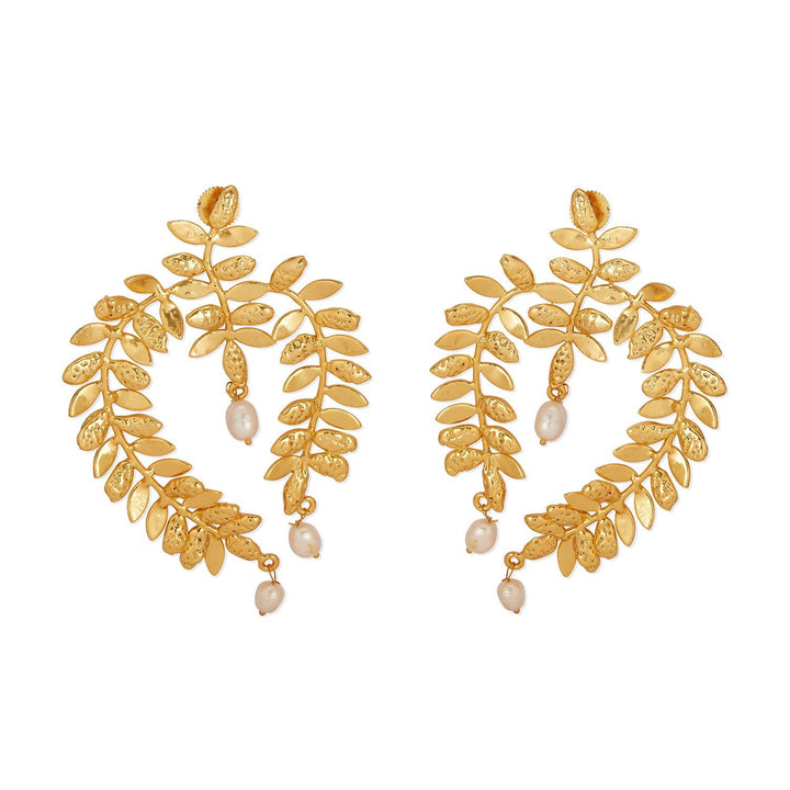 These Gold Hadaira Earrings with Pearls by Dhwani Bansal are timeless botanical-inspired treasures. Textured gold-plated leaves entwine with lustrous baroque pearls, evoking vines in soft motion. Feminine and versatile, they combine organic beauty with sculptural detail, perfect for both everyday and special occasions.