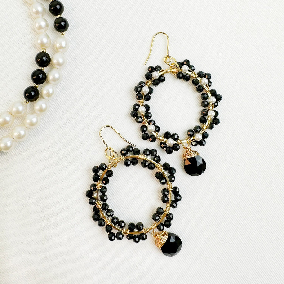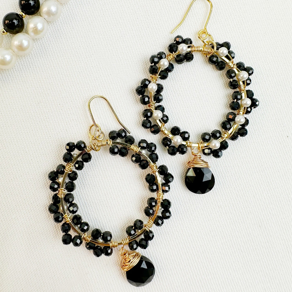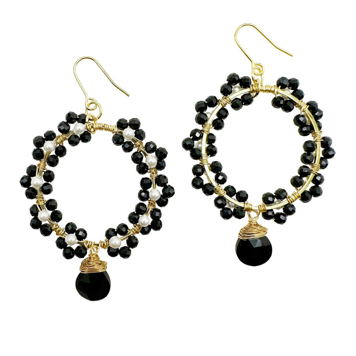 These dangle earrings feature handcrafted black agate flower rings. The specific metal for the hook and fittings is not listed.