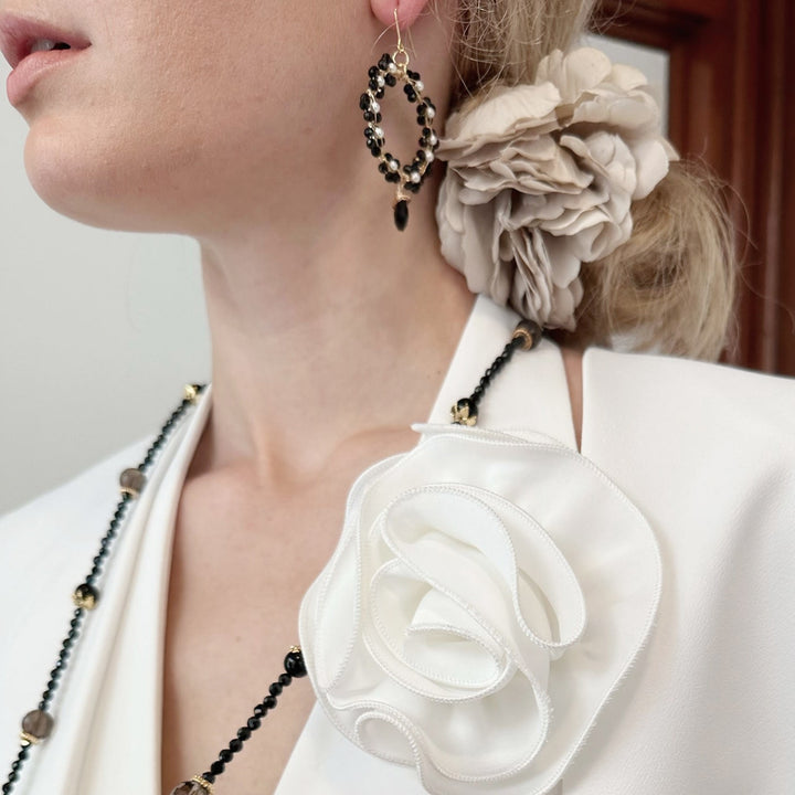 These Handcrafted Black Agate Flower Ring Dangle Earrings by Farra are a versatile and captivating accessory. The black agate flower rings create a sense of mystery and depth, while the dangle design adds a touch of movement and sophistication. These earrings are perfect for adding a little extra flair to any outfit, from an elegant evening gown to a simple blouse and jeans.